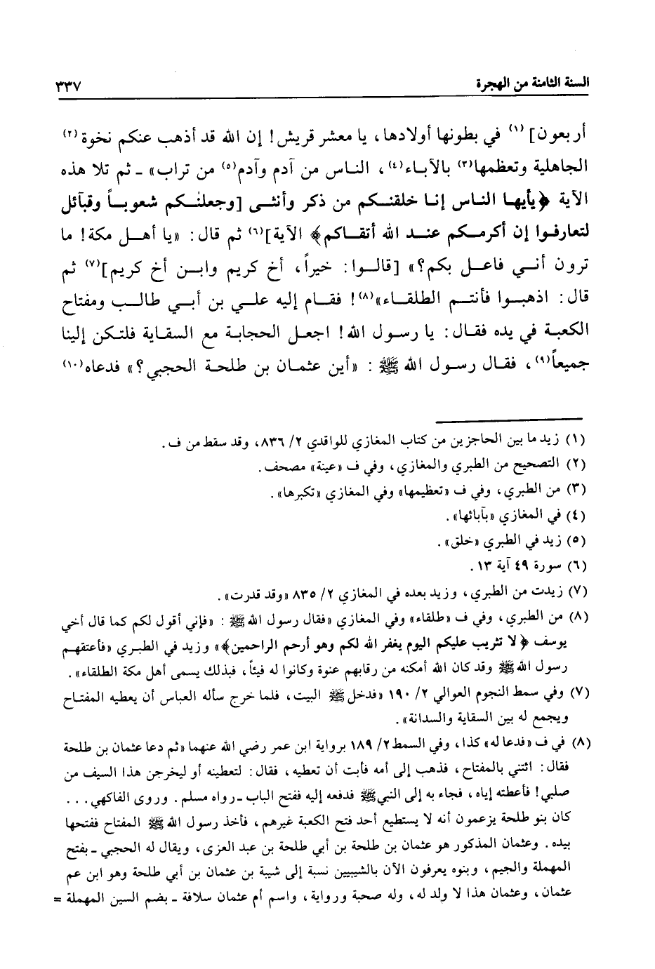 أربعون] «1» في بطونها أولادها، يا معشر قريش! إن الله قد أذهب عنكم نخوة «2» الجاهلية وتعظمها «3» بالآباء «4» ، الناس من آدم وآدم «5» من تراب» - ثم تلا هذه الآية يا أَيُّهَا النَّاسُ إِنَّا خَلَقْناكُمْ مِنْ ذَكَرٍ وَأُنْثى [وَجَعَلْناكُمْ شُعُوباً وَقَبائِلَ لِتَعارَفُوا إِنَّ أَكْرَمَكُمْ عِنْدَ اللَّهِ أَتْقاكُمْ الآية] «6» ثم قال: «يا أهل مكة! ما ترون أني فاعل بكم؟» [قالوا: خيرا، أخ كريم وابن أخ كريم] «7» ثم قال: اذهبوا فأنتم الطلقاء» «8» ! فقام إليه علي بن أبي طالب ومفتاح الكعبة في يده فقال: يا رسول الله! اجعل الحجابة مع السقاية فلتكن إلينا جميعا «9» ، فقال رسول الله صلى الله عليه وسلم: «أين عثمان بن طلحة الحجبي؟» فدعاه «10»