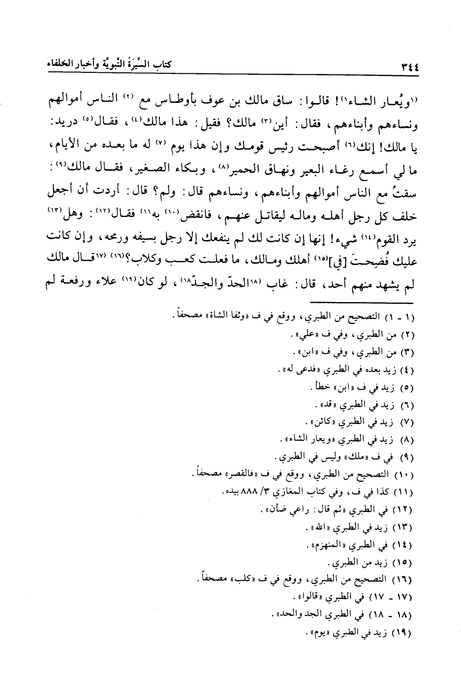 يا مالك! إنك «6» أصبحت رئيس قومك وإن هذا يوم «7» له ما بعده من الأيام، مالي أسمع رغاء البعير ونهاق الحمير «8» ، وبكاء الصغير، فقال مالك «9» :