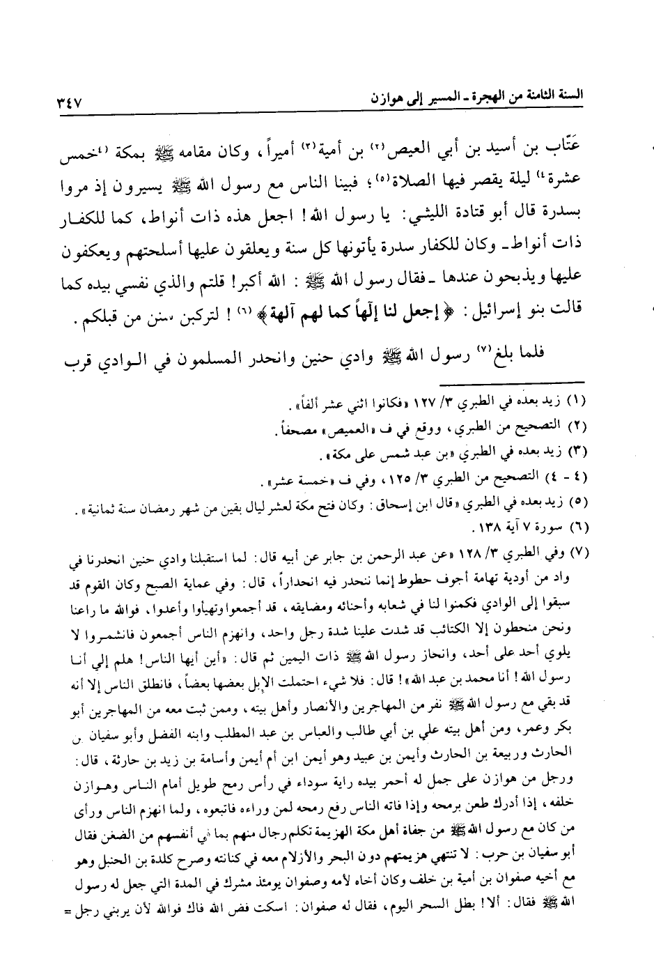 (7) وفي الطبري 3/ 128 «عن عبد الرحمن بن جابر عن أبيه قال: لما استقبلنا وادي حنين انحدرنا في واد من أودية تهامة أجوف حطوط إنما ننحدر فيه انحدارا، قال: وفي عماية الصبح وكان القوم قد سبقوا إلى الوادي فكمنوا لنا في شعابه وأحنائه ومضايقه، قد أجمعوا وتهيأوا وأعدوا، فو الله ما راعنا ونحن منحطون إلا الكتائب قد شدت علينا شدة رجل واحد، وانهزم الناس أجمعون فانشمروا لا يلوي أحد على أحد، وانحاز رسول الله صلى الله عليه وسلم ذات اليمين ثم قال: «أين أيها الناس! هلم إلي أنا رسول الله! أنا محمد بن عبد الله» ! قال: فلا شيء احتملت الإبل بعضها بعضا، فانطلق الناس إلا أنه قد بقي مع رسول الله صلى الله عليه وسلم نفر من المهاجرين والأنصار وأهل بيته، وممن ثبت معه من المهاجرين أبو بكر وعمر، ومن أهل بيته علي بن أبي طالب والعباس بن عبد المطلب وابنه الفضل وأبو سفيان بن الحارث وربيعة بن الحارث وأيمن بن عبيد وهو أيمن ابن أم أيمن وأسامة بن زيد بن حارثة، قال: ورجل من هوازن على جمل له أحمر بيده راية سوداء في رأس رمح طويل أمام الناس وهوازن خلفه، إذا أدرك طعن برمحه وإذا فاته الناس رفع رمحه لمن وراءه فاتبعوه، ولما انهزم الناس ورأى من كان مع رسول الله صلى الله عليه وسلم من جفاة أهل مكة الهزيمة تكلم رجال منهم بما في أنفسهم من الضغن فقال أبو سفيان بن حرب: لا تنتهي هزيمتهم دون البحر والأزلام معه في كنانته وصرح كلدة بن الحنبل وهو مع أخيه صفوان بن أمية بن خلف وكان أخاه لأمه وصفوان يومئذ مشرك في المدة التي جعل له رسول الله صلى الله عليه وسلم فقال: ألا! بطل السحر اليوم، فقال له صفوان: اسكت فض الله فاك فو الله لأن يربني رجل