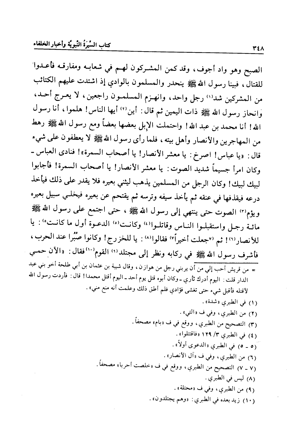 الصبح وهو واد أجوف، وقد كمن المشركون لهم في شعابه ومفارقه فأعدوا للقتال، فبينا رسول الله صلى الله عليه وسلم ينحدر والمسلمون بالوادي إذ اشتدت عليهم الكتائب من المشركين شد «1» رجل واحد، وانهزم المسلمون راجعين، لا يعرج أحد، وانحاز رسول الله صلى الله عليه وسلم ذات اليمين ثم قال: أين «2» أيها الناس! هلموا، أنا رسول الله! أنا محمد بن عبد الله! واحتملت الإبل بعضها بعضا ومع رسول الله صلى الله عليه وسلم رهط من المهاجرين والأنصار وأهل بيته، فلما رأى رسول الله صلى الله عليه وسلم لا يعطفون على شيء قال: «يا عباس! اصرخ: يا معشر الأنصار! يا أصحاب السمرة» ! فنادى العباس- وكان امرأ جسيما شديد الصوت: يا معشر الأنصار! يا أصحاب السمرة! فأجابوا لبيك لبيك! وكان الرجل من المسلمين يذهب ليثني بعيره فلا يقدر على ذلك فيأخذ درعه فيقذفها في عنقه ثم يأخذ سيفه وترسه ثم يقتحم عن بعيره فيخلي سبيل بعيره ويؤم «3» الصوت حتى ينتهي إلى رسول الله صلى الله عليه وسلم، حتى اجتمع على رسول الله صلى الله عليه وسلم مائة رجل واستقبلوا الناس وقاتلوا «4» وكانت «5» الدعوة أول ما كانت «5» : يا للأنصار «6» ! ثم «7» جعلت أخيرا «7» فقالوا «8» : يا للخزرج! وكانوا صبرا عند الحرب، فأشرف رسول الله صلى الله عليه وسلم في ركابه ونظر إلى مجتلد «9» القوم «10» فقال: «الآن حمي