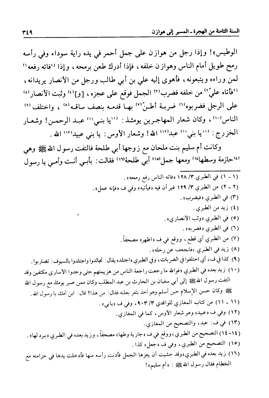وكانت أم سليم بنت ملحان مع زوجها أبي طلحة فالتفت رسول الله صلى الله عليه وسلم وهي «14» حازمة وسطها «14» ومعها جمل «15» أبي طلحة «16» فقالت: بأبي أنت وأمي يا رسول