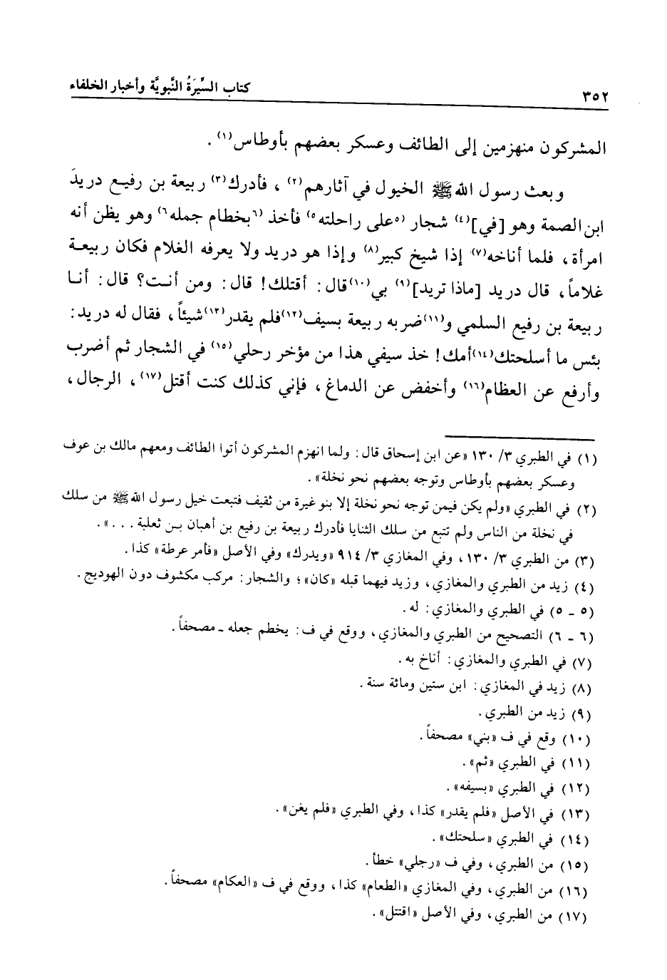 (2) في الطبري «ولم يكن فيمن توجه نحو نخلة إلا بنو غيرة من ثقيف فتبعت خيل رسول الله صلى الله عليه وسلم من سلك في نخلة من الناس ولم تتبع من سلك الثنايا فأدرك ربيعة بن رفيع بن أهبان بن ثعلبة ... » .
