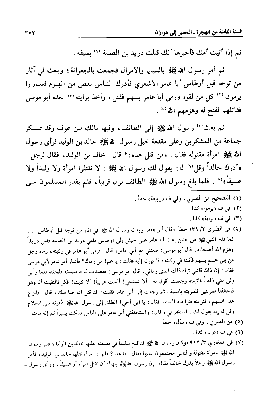 (4) في الطبري 3/ 131 خطأ «قال أبو جعفر وبعث رسول الله صلى الله عليه وسلم في آثار من توجه قبل أوطاس ... لما قدم النبي صلى الله عليه وسلم من حنين بعث أبا عامر على جيش إلى أوطاس فلقي دريد بن الصمة فقتل دريدا وهزم الله أصحابه. قال أبو موسى: فبعثني مع أبي عامر، قال: فرمى أبو عامر في ركبته، رماه رجل من بني جشم بسهم فأثبته في ركبته، فانتهيت إليه فقلت: يا عم! من رماك؟ فأشار أبو عامر لأبي موسى فقال: إن ذاك قاتلي تراه ذلك الذي رماني. قال أبو موسى: فقصدت له فاعتمدته فلحقته فلما رآني ولى عني ذاهبا فاتبعته وجعلت أقول له: ألا تستحي! ألست عربيا! ألا تثبت! فكر فالتقيت أنا وهو فاختلفنا ضربتين فضربته بالسيف ثم رجعت إلى أبي عامر فقلت: قد قتل الله صاحبك، قال: فانزع هذا السهم، فنزعته فنزا منه الماء؛ فقال: يا ابن أخي! انطلق إلى رسول الله صلى الله عليه وسلم فأقرئه مني السلام وقل له إنه يقول لك: استغفر لي، قال: واستخلفني أبو عامر على الناس فمكث يسيرا ثم إنه مات.