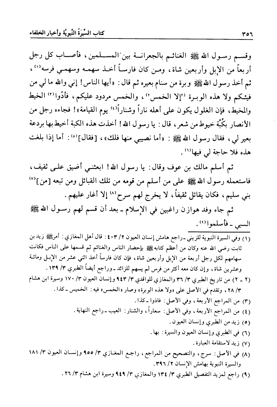 (1) وفي السيرة النبوية للزيني- راجع هامش إنسان العيون 2/ 403: قال أهل المغازي: أمر صلى الله عليه وسلم زيد بن ثابت رضي الله عنه وكان من أعظم كتابه صلى الله عليه وسلم بإحضار الناس والغنائم ثم قسمها على الناس فكانت سهامهم لكل رجل أربعة من الإبل وأربعين شاة، فإن كان فارسا أخذ اثني عشر من الإبل ومائة وعشرين شاة، وإن كان معه أكثر من فرس لم يسهم للزائد- وراجع أيضا الطبري 3/ 139.