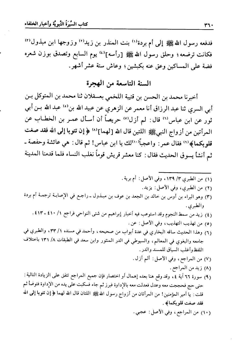 (9) سورة 66 آية 4، وقد وقع هنا بعده إهمال أو اختصار فإن جميع المراجع تتفق على الزيادة التالية: حتى حج فحججت معه وعدل فعدلت معه بالإداوة فبرز ثم جاء فسكبت على يده من الإداوة فتوضأ ثم قلت: يا أمير المؤمنين! من المرأتان من أزواج رسول الله صلى الله عليه وسلم اللتان قال الله لهما إِنْ تَتُوبا إِلَى اللَّهِ فَقَدْ صَغَتْ قُلُوبُكُما.