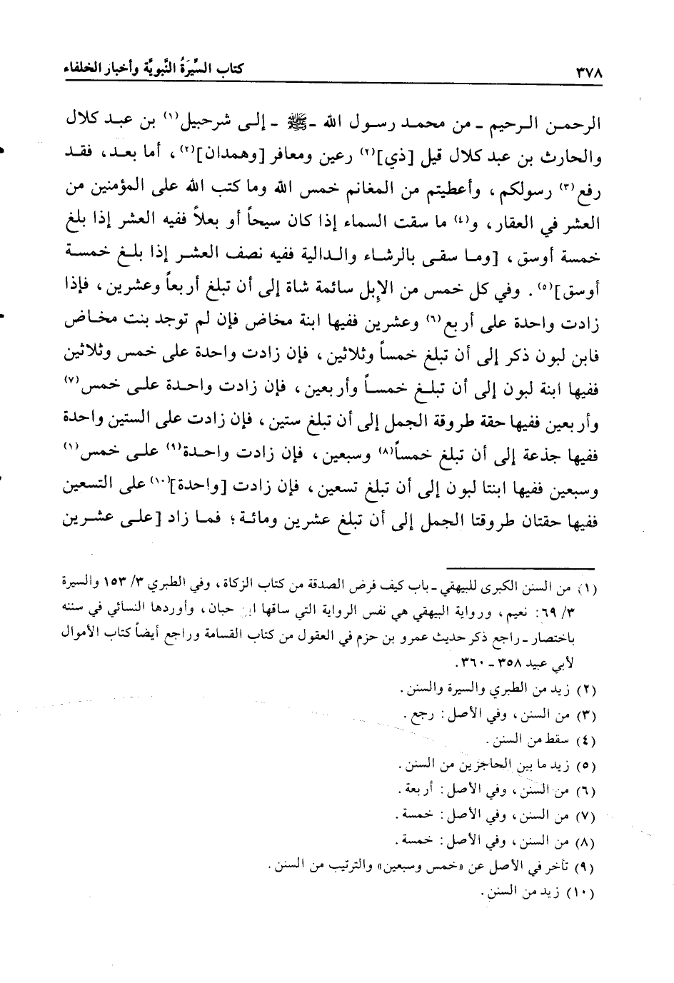 (1) من السنن الكبرى للبيهقي- باب كيف فرض الصدقة من كتاب الزكاة، وفي الطبري 3/ 153 والسيرة 3/ 69: نعيم، ورواية البيهقي هي نفس الرواية التي ساقها ابن حبان، وأوردها النسائي في سننه باختصار- راجع ذكر حديث عمرو بن حزم في العقول من كتاب القسامة وراجع أيضا كتاب الأموال لأبي عبيد 358- 360.