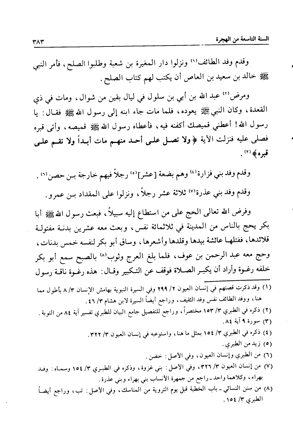 (1) وقد ذكرت قصتهم في إنسان العيون 2/ 299 وفي السيرة النبوية بهامش الإنسان 3/ 8 بأطول مما هنا، ووفد الطائف نفس وفد الثقيف، وراجع أيضا السيرة لابن هشام 3/ 46.
