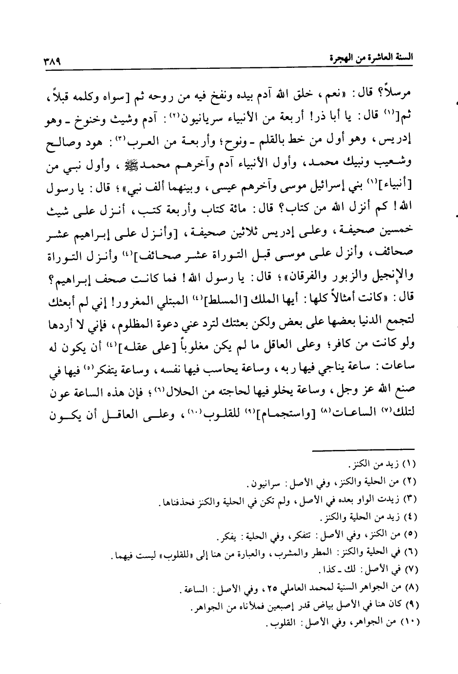 مرسلا؟ قال: «نعم، خلق الله آدم بيده ونفخ فيه من روحه ثم [سواه وكلمه قبلا، ثم [ «1» قال: يا أبا ذر! أربعة من الأنبياء سريانيون «2» : آدم وشيث وخنوخ- وهو إدريس، وهو أول من خط بالقلم- ونوح؛ وأربعة من العرب «3» : هود وصالح وشعيب ونبيك محمد، وأول الأنبياء آدم وآخرهم محمد صلى الله عليه وسلم، وأول نبي من [أنبياء] «1» بني إسرائيل موسى وآخرهم عيسى، وبينهما ألف نبي» ؛ قال: يا رسول الله! كم أنزل الله من كتاب؟ قال: مائة كتاب وأربعة كتب، أنزل على شيث خمسين صحيفة، وعلى إدريس ثلاثين صحيفة، [وأنزل على إبراهيم عشر صحائف، وأنزل على موسى قبل التوراة عشر صحائف] «4» وأنزل التوراة والإنجيل والزبور والفرقان» ؛ قال: يا رسول الله! فما كانت صحف إبراهيم؟