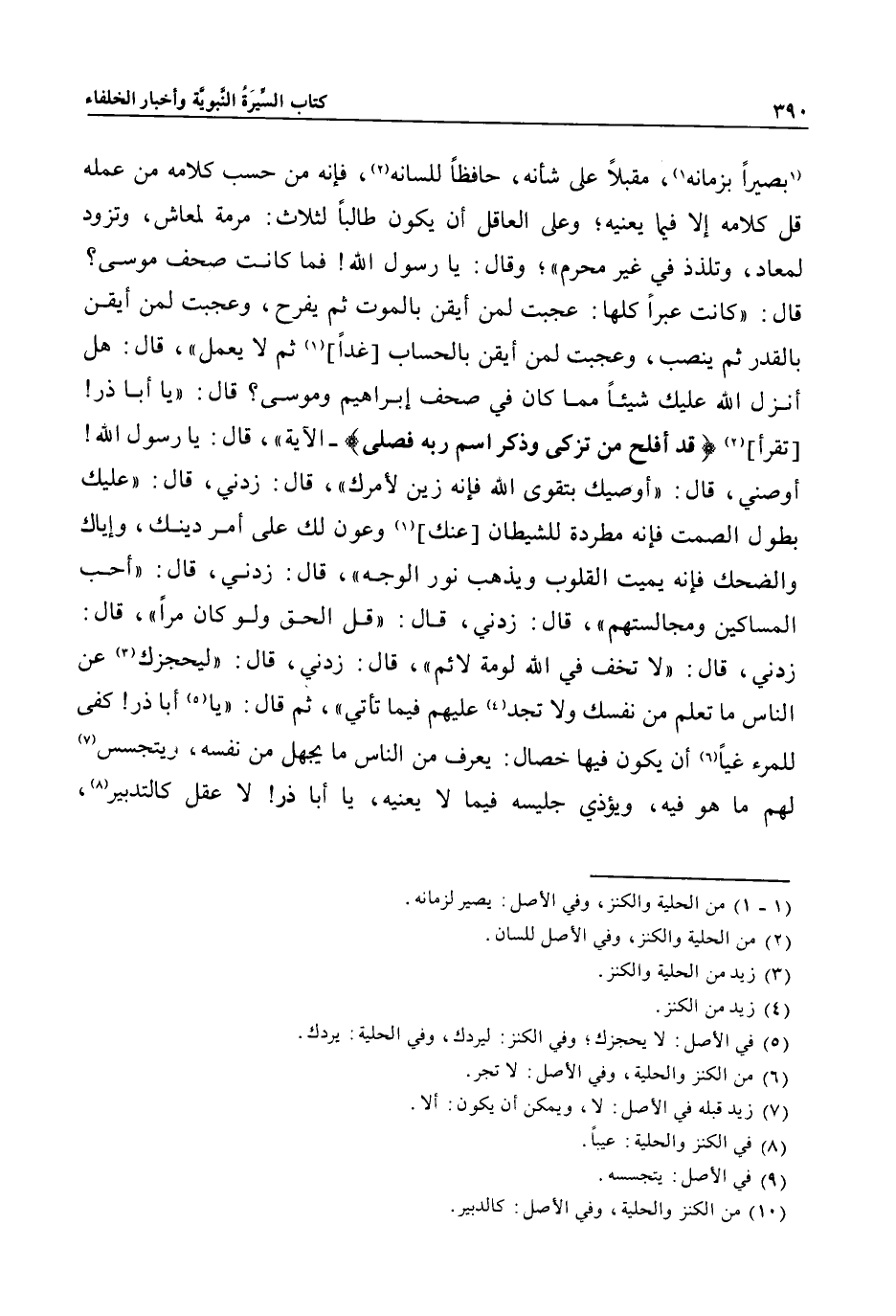 «1» بصيرا بزمانه «1» ، مقبلا على شأنه، حافظا للسانه «2» ، فإنه من حسب كلامه من عمله قل كلامه إلا فيما يعنيه؛ وعلى العاقل أن يكون طالبا لثلاث: مرمة لمعاش، وتزود لمعاد، وتلذذ في غير محرم» ؛ وقال: يا رسول الله! فما كانت صحف موسى؟