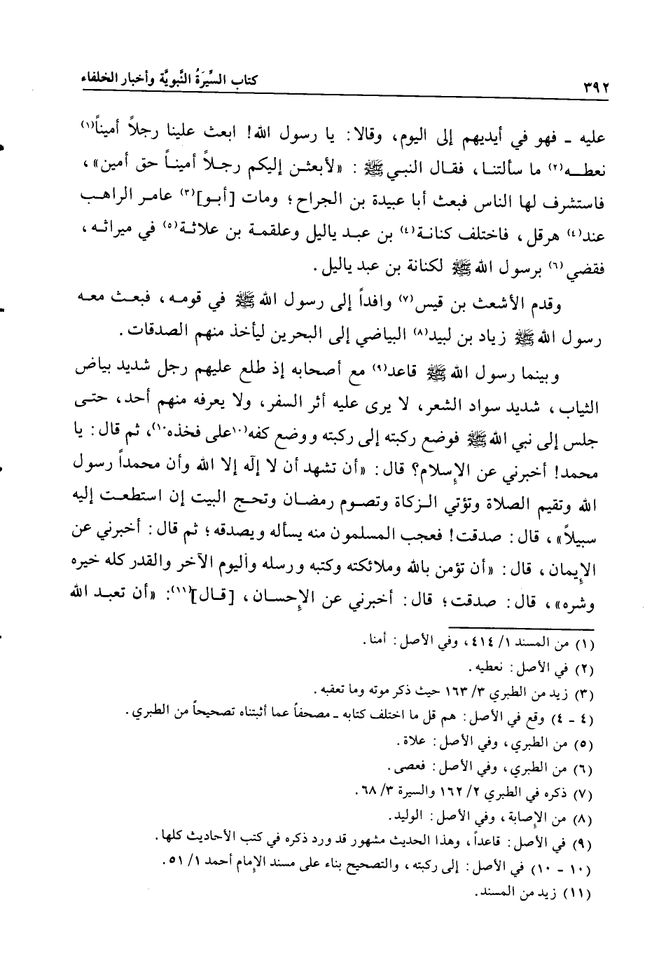 وبينما رسول الله صلى الله عليه وسلم قاعد «9» مع أصحابه إذ طلع عليهم رجل شديد بياض الثياب، شديد سواد الشعر، لا يرى عليه أثر السفر، ولا يعرفه منهم أحد، حتى جلس إلى نبي الله صلى الله عليه وسلم فوضع ركبته إلى ركبته ووضع كفه «10» على فخذه «10» ، ثم قال: يا محمد! أخبرني عن الإسلام؟ قال: «أن تشهد أن لا إله إلا الله وأن محمدا رسول الله وتقيم الصلاة وتؤتي الزكاة وتصوم رمضان وتحج البيت إن استطعت إليه سبيلا» ، قال: صدقت! فعجب المسلمون منه يسأله ويصدقه؛ ثم قال: أخبرني عن الإيمان، قال: «أن تؤمن بالله وملائكته وكتبه ورسله واليوم الآخر والقدر كله خيره وشره» ، قال: صدقت؛ قال: أخبرني عن الإحسان، [قال] «11» : «أن تعبد الله