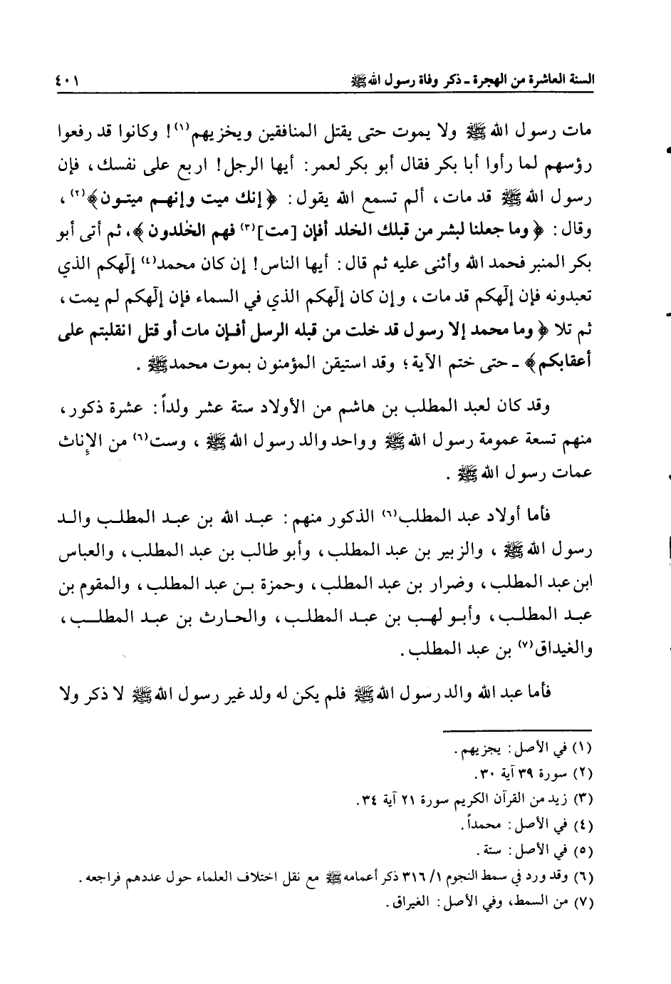 (6) وقد ورد في سمط النجوم 1/ 316 ذكر أعمامه صلى الله عليه وسلم مع نقل اختلاف العلماء حول عددهم فراجعه.