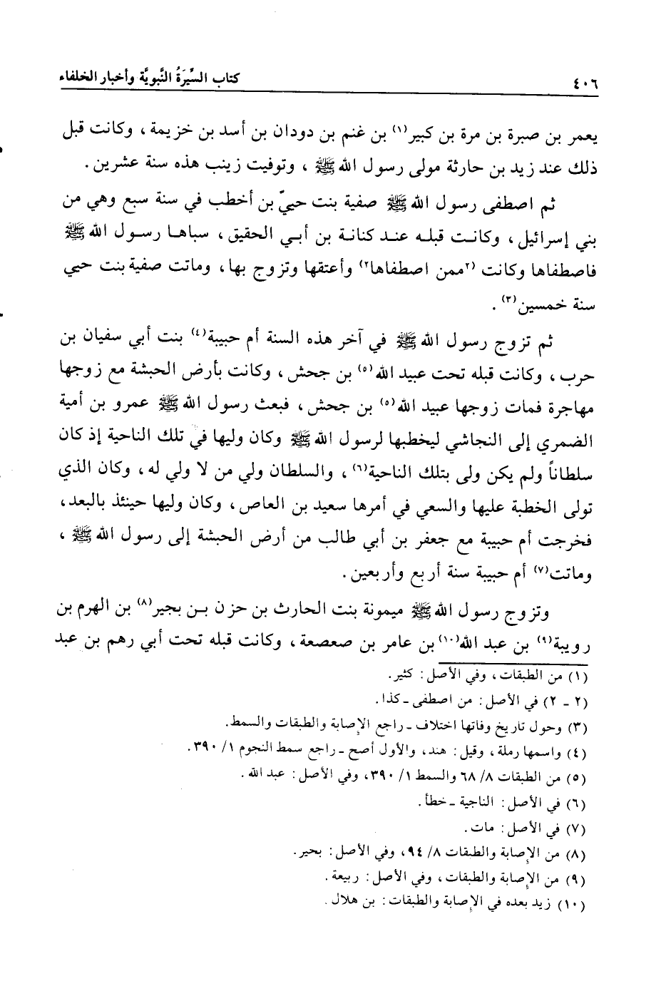 ثم تزوج رسول الله صلى الله عليه وسلم في آخر هذه السنة أم حبيبة «4» بنت أبي سفيان بن حرب، وكانت قبله تحت عبيد الله «5» بن جحش، وكانت بأرض الحبشة مع زوجها مهاجرة فمات زوجها عبيد الله «5» بن جحش، فبعث رسول الله صلى الله عليه وسلم عمرو بن أمية الضمري إلى النجاشي ليخطبها لرسول الله صلى الله عليه وسلم وكان وليها في تلك الناحية إذ كان سلطانا ولم يكن ولى بتلك الناحية «6» ، والسلطان ولي من لا ولي له، وكان الذي تولى الخطبة عليها والسعي في أمرها سعيد بن العاص، وكان وليها حينئذ بالبعد، فخرجت أم حبيبة مع جعفر بن أبي طالب من أرض الحبشة إلى رسول الله صلى الله عليه وسلم، وماتت»