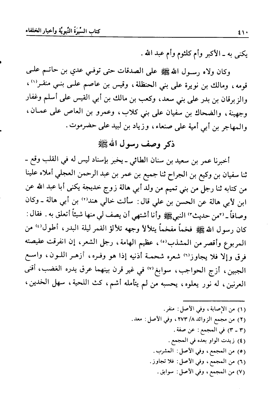 أخبرنا عمر بن سعيد بن سنان الطائي- يخبر بإسناد ليس له في القلب وقع- ثنا سفيان بن وكيع بن الجراح ثنا جميع بن عمر بن عبد الرحمن العجلي أملاه علينا من كتابه ثنا رجل من بني تميم من ولد أبي هالة زوج خديجة يكنى أبا عبد الله عن ابن لأبي هالة عن الحسن بن علي قال: سألت خالي هند «2» بن أبي هالة- وكان وصافا- «3» من حديث «3» النبي صلى الله عليه وسلم وأنا أشتهي أن يصف لي منها شيئا أتعلق به. فقال: