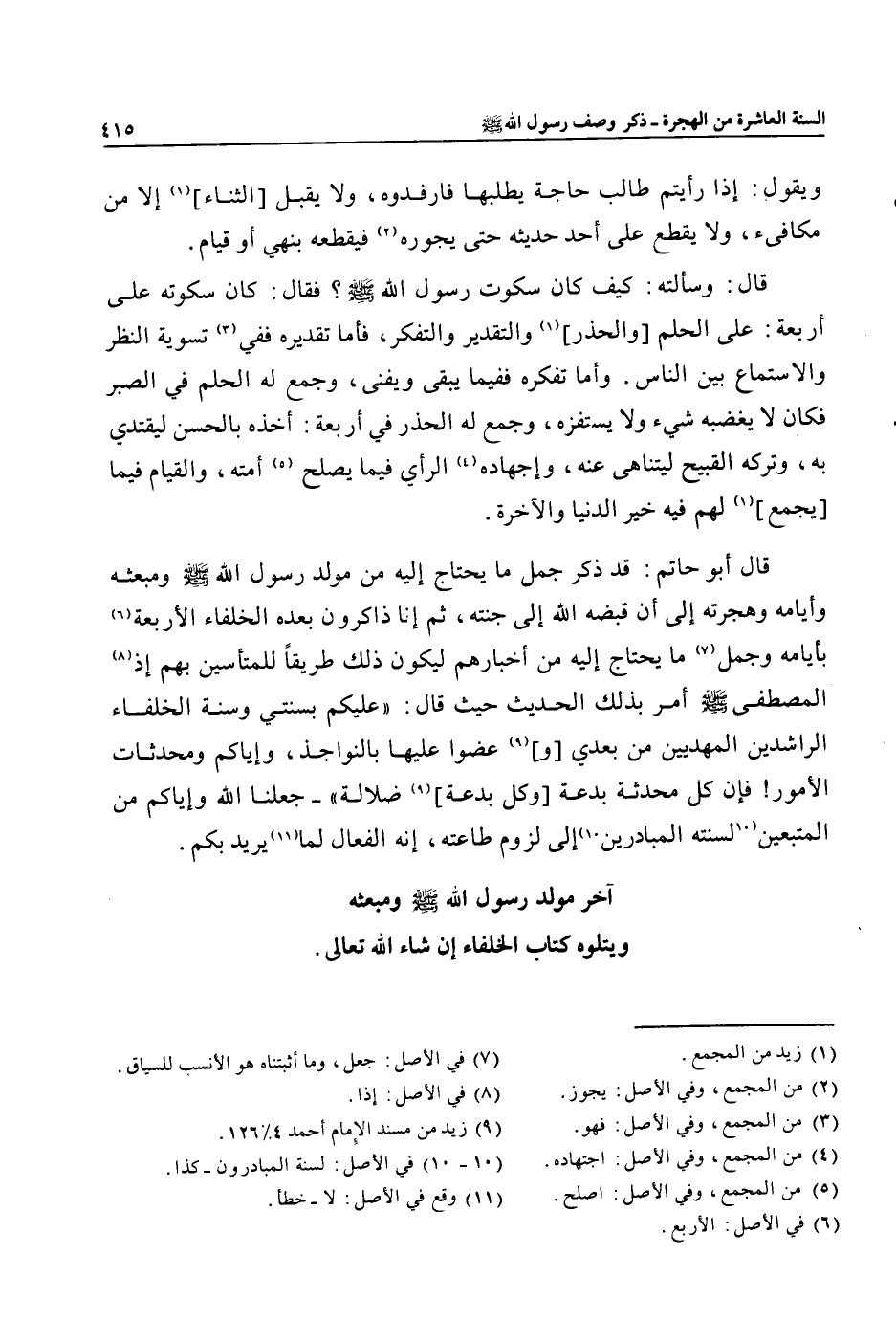 قال أبو حاتم: قد ذكر جمل ما يحتاج إليه من مولد رسول الله صلى الله عليه وسلم ومبعثه وأيامه وهجرته إلى أن قبضه الله إلى جنته، ثم إنا ذاكرون بعده الخلفاء الأربعة «6» بأيامه وجمل «7» ما يحتاج إليه من أخبارهم ليكون ذلك طريقا للمتأسين بهم إذ «8» المصطفى صلى الله عليه وسلم أمر بذلك الحديث حيث قال: «عليكم بسنتي وسنة الخلفاء الراشدين المهديين من بعدي [و] «9» عضوا عليها بالنواجذ، وإياكم ومحدثات الأمور! فإن كل محدثة بدعة [وكل بدعة] «9» ضلالة» - جعلنا الله وإياكم من المتبعين «10» لسنته المبادرين «10» إلى لزوم طاعته، إنه الفعال لما «11» يريد بكم.