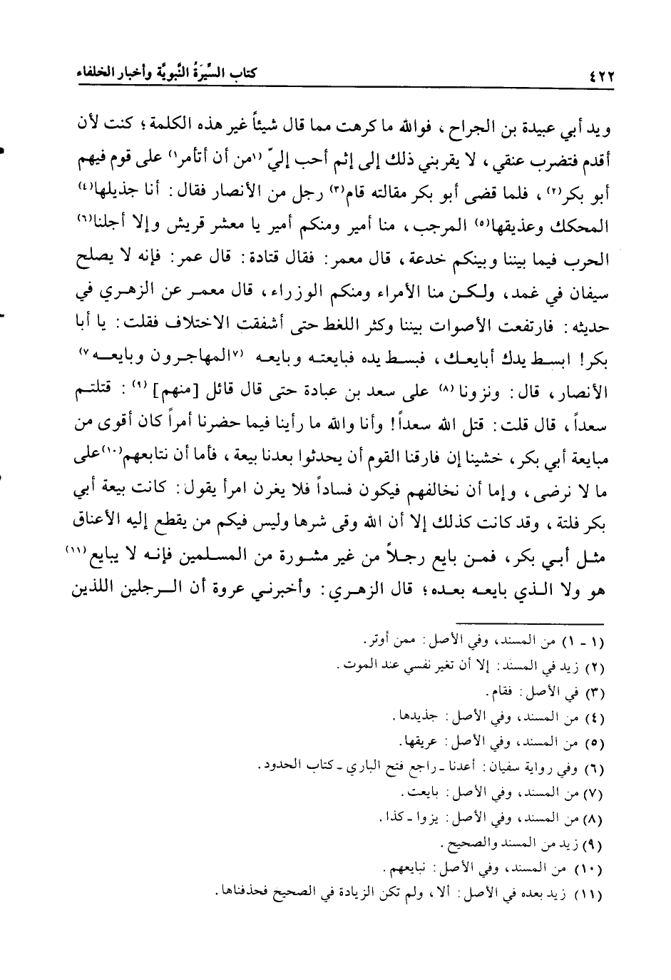 ويد أبي عبيدة بن الجراح، فوالله ما كرهت مما قال شيئا غير هذه الكلمة؛ كنت لأن أقدم فتضرب عنقي، لا يقربني ذلك إلى إثم أحب إليّ «1» من أن أتأمر «1» على قوم فيهم أبو بكر «2» ، فلما قضى أبو بكر مقالته قام «3» رجل من الأنصار فقال: أنا جذيلها «4» المحكك وعذيقها «5» المرجب، منا أمير ومنكم أمير يا معشر قريش وإلا أجلنا «6» الحرب فيما بيننا وبينكم خدعة، قال معمر: فقال قتادة: قال عمر: فإنه لا يصلح سيفان في غمد، ولكن منا الأمراء ومنكم الوزراء، قال معمر عن الزهري في حديثه: فارتفعت الأصوات بيننا وكثر اللغط حتى أشفقت الاختلاف فقلت: يا أبا بكر! ابسط يدك أبايعك، فبسط يده فبايعته وبايعه «7» المهاجرون وبايعه «7» الأنصار، قال: ونزونا «8» على سعد بن عبادة حتى قال قائل [منهم] «9» : قتلتم سعدا، قال قلت: قتل الله سعدا! وأنا والله ما رأينا فيما حضرنا أمرا كان أقوى من مبايعة أبي بكر، خشينا إن فارقنا القوم أن يحدثوا بعدنا بيعة، فأما أن نتابعهم «10» على ما لا نرضى، وإما أن نخالفهم فيكون فسادا فلا يغرن امرأ يقول: كانت بيعة أبي بكر فلتة، وقد كانت كذلك إلا أن الله وقى شرها وليس فيكم من يقطع إليه الأعناق مثل أبي بكر، فمن بايع رجلا من غير مشورة من المسلمين فإنه لا يبايع «11» هو ولا الذي بايعه بعده؛ قال الزهري: وأخبرني عروة أن الرجلين اللذين