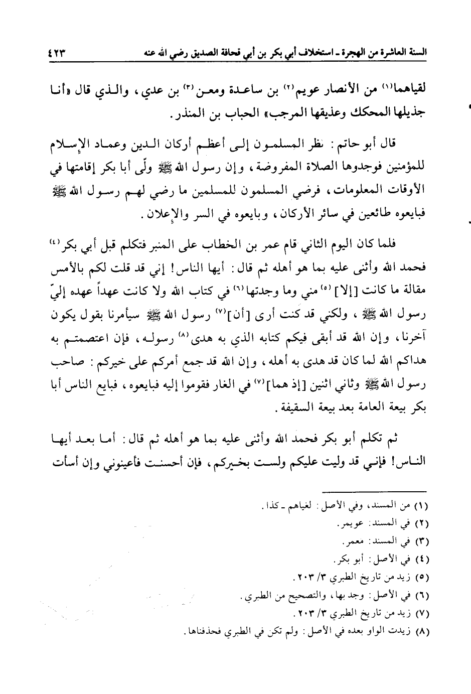 فلما كان اليوم الثاني قام عمر بن الخطاب على المنبر فتكلم قبل أبي بكر «4» فحمد الله وأثنى عليه بما هو أهله ثم قال: أيها الناس! إني قد قلت لكم بالأمس مقالة ما كانت [إلا] «5» مني وما وجدتها «6» في كتاب الله ولا كانت عهدا عهده إليّ رسول الله صلى الله عليه وسلم، ولكني قد كنت أرى [أن] «7» رسول الله صلى الله عليه وسلم سيأمرنا بقول يكون آخرنا، وإن الله قد أبقى فيكم كتابه الذي به هدى «8» رسوله، فإن اعتصمتم به هداكم الله لما كان قد هدى به أهله، وإن الله قد جمع أمركم على خيركم: صاحب رسول الله صلى الله عليه وسلم وثاني اثنين [إذ هما] «7» في الغار فقوموا إليه فبايعوه، فبايع الناس أبا بكر بيعة العامة بعد بيعة السقيفة.