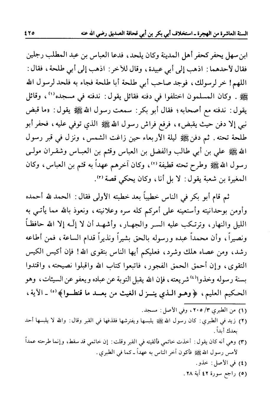 اللهم! خر لرسولك، فوجد صاحب أبي طلحة أبا طلحة فجاء به فلحد لرسول الله صلى الله عليه وسلم. وكان المسلمون اختلفوا في دفنه فقائل يقول: ندفنه في مسجده «1» ، وقائل يقول: ندفنه مع أصحابه؛ فقال أبو بكر: سمعت رسول الله صلى الله عليه وسلم يقول: «ما قبض نبي إلا دفن حيث يقبض» ، فرفع فراش رسول الله صلى الله عليه وسلم الذي توفي عليه، فحفر أبو طلحة تحته. ثم دفن صلى الله عليه وسلم ليلة الأربعاء حين زاغت الشمس، ونزل في قبر رسول الله صلى الله عليه وسلم علي بن أبي طالب والفضل بن العباس وقثم بن العباس وشقران مولى رسول الله صلى الله عليه وسلم وطرح تحته قطيفة «2» ، وكان آخرهم عهدا به قثم بن العباس، وكان المغيرة بن شعبة يقول: لا بل أنا، وكان يحكي قصة «3» .