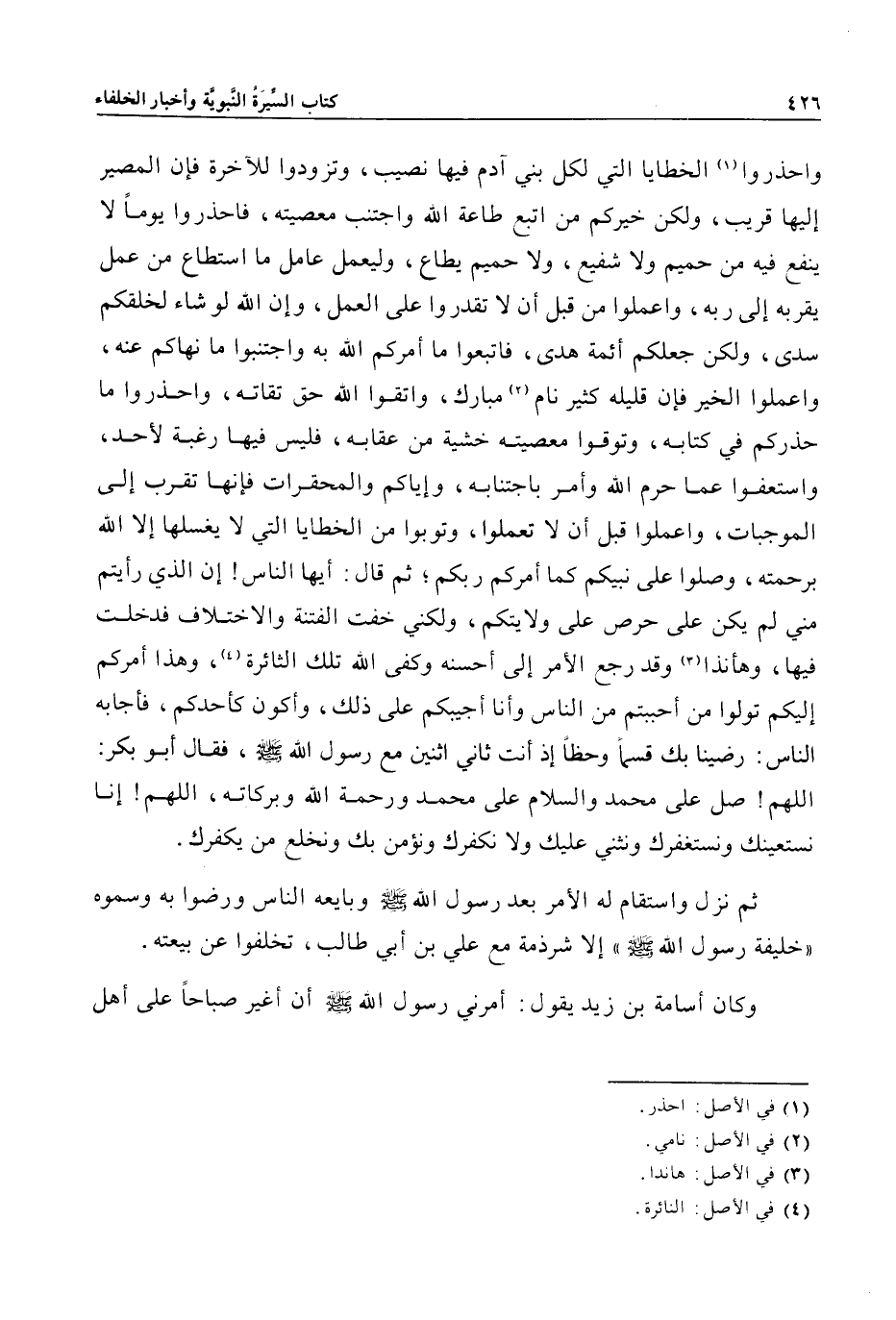 واحذروا «1» الخطايا التي لكل بني آدم فيها نصيب، وتزودوا للآخرة فإن المصير إليها قريب، ولكن خيركم من اتبع طاعة الله واجتنب معصيته، فاحذروا يوما لا ينفع فيه من حميم ولا شفيع، ولا حميم يطاع، وليعمل عامل ما استطاع من عمل يقربه إلى ربه، واعملوا من قبل أن لا تقدروا على العمل، وإنّ الله لو شاء لخلقكم سدى، ولكن جعلكم أئمة هدى، فاتبعوا ما أمركم الله به واجتنبوا ما نهاكم عنه، واعملوا الخير فإن قليله كثير نام «2» مبارك، واتقوا الله حق تقاته، واحذروا ما حذركم في كتابه، وتوقوا معصيته خشية من عقابه، فليس فيها رغبة لأحد، واستعفوا عما حرم الله وأمر باجتنابه، وإياكم والمحقرات فإنها تقرب إلى الموجبات، واعملوا قبل أن لا تعملوا، وتوبوا من الخطايا التي لا يغسلها إلا الله برحمته، وصلوا على نبيكم كما أمركم ربكم؛ ثم قال: أيها الناس! إن الذي رأيتم مني لم يكن على حرص على ولايتكم، ولكني خفت الفتنة والاختلاف فدخلت فيها، وهأنذا «3» وقد رجع الأمر إلى أحسنه وكفى الله تلك الثائرة «4» ، وهذا أمركم إليكم تولوا من أحببتم من الناس وأنا أجيبكم على ذلك، وأكون كأحدكم، فأجابه الناس: رضينا بك قسما وحظا إذ أنت ثاني اثنين مع رسول الله صلى الله عليه وسلم، فقال أبو بكر: