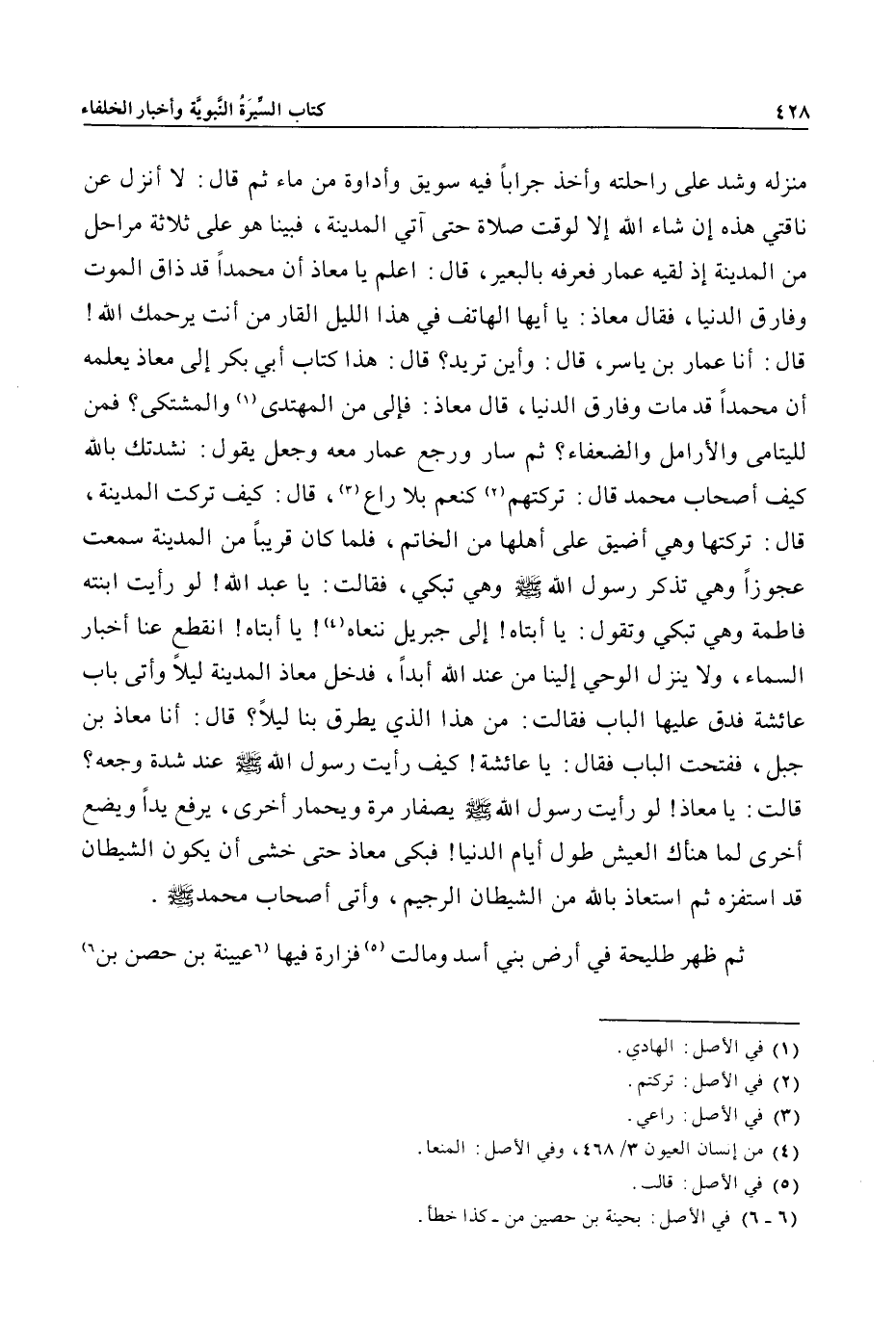 منزله وشد على راحلته وأخذ جرابا فيه سويق وأداوة من ماء ثم قال: لا أنزل عن ناقتي هذه إن شاء الله إلا لوقت صلاة حتى آتي المدينة، فبينا هو على ثلاثة مراحل من المدينة إذ لقيه عمار فعرفه بالبعير، قال: اعلم يا معاذ أن محمدا قد ذاق الموت وفارق الدنيا، فقال معاذ: يا أيها الهاتف في هذا الليل القار من أنت يرحمك الله! قال: أنا عمار بن ياسر، قال: وأين تريد؟ قال: هذا كتاب أبي بكر إلى معاذ يعلمه أن محمدا قد مات وفارق الدنيا، قال معاذ: فإلى من المهتدى «1» والمشتكى؟ فمن لليتامى والأرامل والضعفاء؟ ثم سار ورجع عمار معه وجعل يقول: نشدتك بالله كيف أصحاب محمد قال: تركتهم «2» كنعم بلا راع «3» ، قال: كيف تركت المدينة، قال: تركتها وهي أضيق على أهلها من الخاتم، فلما كان قريبا من المدينة سمعت عجوزا وهي تذكر رسول الله صلى الله عليه وسلم وهي تبكي، فقالت: يا عبد الله! لو رأيت ابنته فاطمة وهي تبكي وتقول: يا أبتاه! إلى جبريل ننعاه «4» ! يا أبتاه! انقطع عنا أخبار السماء، ولا ينزل الوحي إلينا من عند الله أبدا، فدخل معاذ المدينة ليلا وأتى باب عائشة فدق عليها الباب فقالت: من هذا الذي يطرق بنا ليلا؟ قال: أنا معاذ بن جبل، ففتحت الباب فقال: يا عائشة! كيف رأيت رسول الله صلى الله عليه وسلم عند شدة وجعه؟