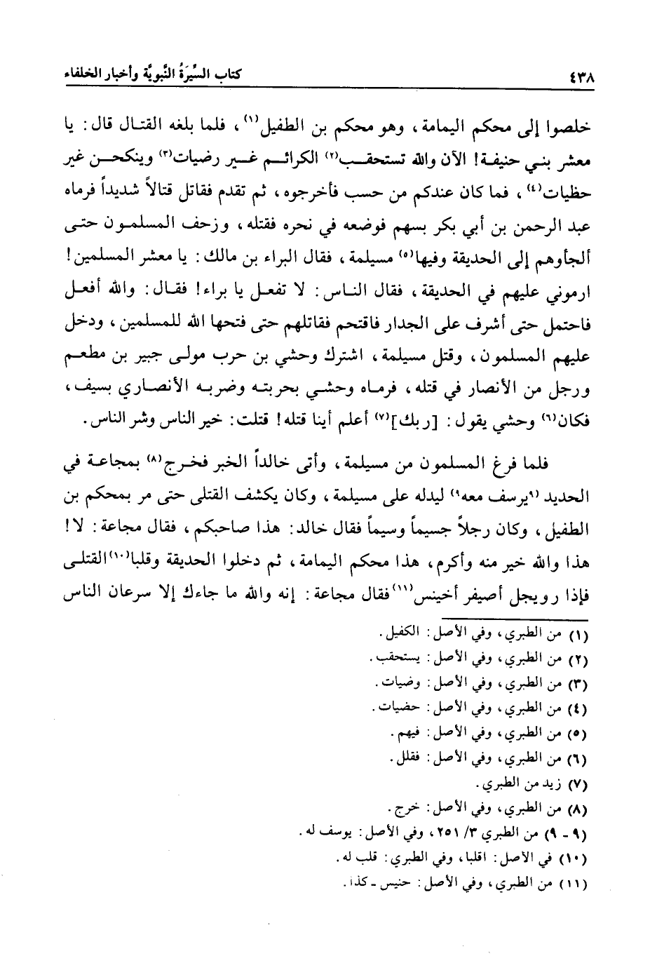 خلصوا إلى محكم اليمامة، وهو محكم بن الطفيل «1» ، فلما بلغه القتال قال: يا معشر بني حنيفة! الآن والله تستحقب «2» الكرائم غير رضيات «3» وينكحن غير حظيات «4» ، فما كان عندكم من حسب فأخرجوه، ثم تقدم فقاتل قتالا شديدا فرماه عبد الرحمن بن أبي بكر بسهم فوضعه في نحره فقتله، وزحف المسلمون حتى ألجأوهم إلى الحديقة وفيها «5» مسيلمة، فقال البراء بن مالك: يا معشر المسلمين! ارموني عليهم في الحديقة، فقال الناس: لا تفعل يا براء! فقال: والله أفعل فاحتمل حتى أشرف على الجدار فاقتحم فقاتلهم حتى فتحها الله للمسلمين، ودخل عليهم المسلمون، وقتل مسيلمة، اشترك وحشي بن حرب مولى جبير بن مطعم ورجل من الأنصار في قتله، فرماه وحشي بحربته وضربه الأنصاري بسيف، فكان «6» وحشي يقول: [ربك] «7» أعلم أينا قتله! قتلت: خير الناس وشر الناس.