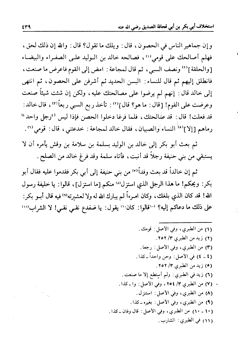 ثم إن خالدا قد بعث وفدا «7» من بني حنيفة إلى أبي بكر فقدموا عليه فقال أبو بكر: ويحكم! ما هذا الرجل الذي استزل «8» منكم [ما استزل] ، قالوا: يا خليفة رسول الله! قد كان الذي بلغك، وكان امرءا لم يبارك الله له ولا لعشيرته «9» فيه قال أبو بكر: