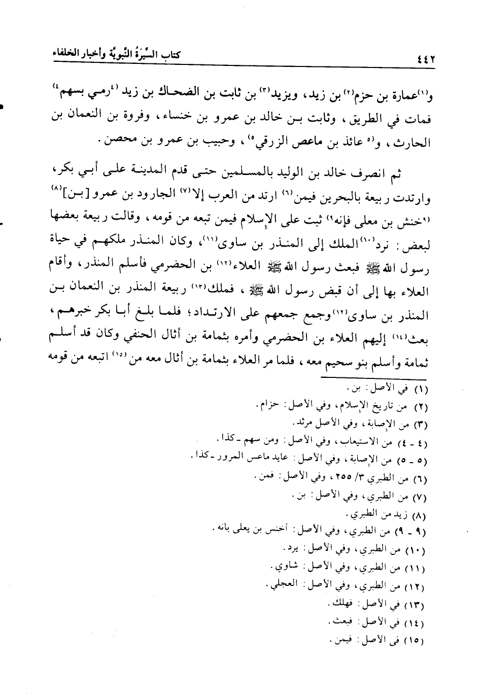 ثم انصرف خالد بن الوليد بالمسلمين حتى قدم المدينة على أبي بكر، وارتدت ربيعة بالبحرين فيمن «6» ارتد من العرب إلا «7» الجارود بن عمرو [بن] «8» «9» خنش بن معلى فإنه «9» ثبت على الإسلام فيمن تبعه من قومه، وقالت ربيعة بعضها لبعض: نرد «10» الملك إلى المنذر بن ساوى 1»