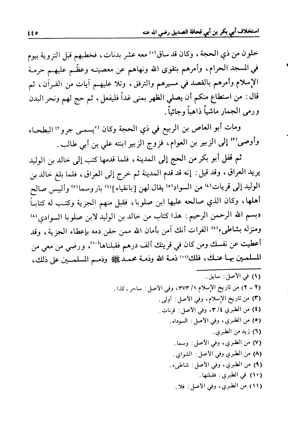 ثم قفل أبو بكر من الحج إلى المدينة، فلما قدمها كتب إلى خالد بن الوليد يريد العراق، وقد قيل: إنه قد قدم المدينة ثم خرج إلى العراق، فلما بلغ خالد بن الوليد إلى قريات «4» من السواد «5» يقال لهن [بانقياء] «6» باروسما «7» وأليبس صالح أهلها، وكان الذي صالحه عليها ابن صلوبا، فقبل منهم الجزية وكتب له كتابا «بسم الله الرحمن الرحيم: هذا كتاب من خالد بن الوليد لابن صلوبا السوادي «8» ومنزله بشاطىء «9» الفرات أنك آمن بأمان الله ممن حقن دمه بإعطاء الجزية، وقد أعطيت عن نفسك ومن كان في قريتك ألف درهم فقبلناها1»