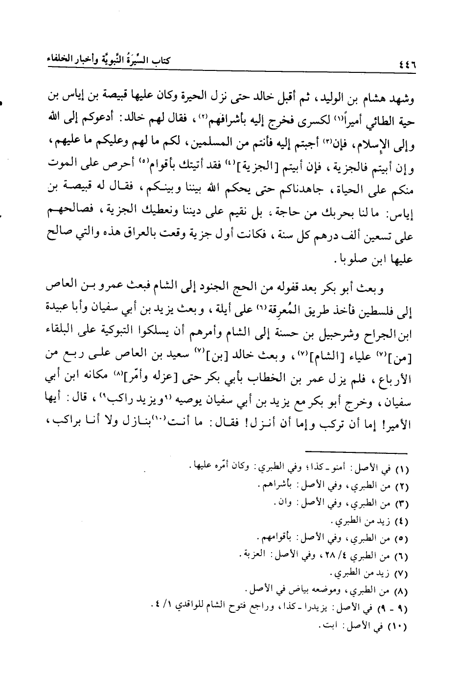 وشهد هشام بن الوليد، ثم أقبل خالد حتى نزل الحيرة وكان عليها قبيصة بن إياس بن حية الطائي أميرا «1» لكسرى فخرج إليه بأشرافهم «2» ، فقال لهم خالد: أدعوكم إلى الله وإلى الإسلام، فإن «3» أجبتم إليه فأنتم من المسلمين، لكم ما لهم وعليكم ما عليهم، وإن أبيتم فالجزية، فإن أبيتم [الجزية] «4» فقد أتيتك بأقوام «5» أحرص على الموت منكم على الحياة، جاهدناكم حتى يحكم الله بيننا وبينكم، فقال له قبيصة بن إياس: ما لنا بحربك من حاجة، بل نقيم على ديننا ونعطيك الجزية، فصالحهم على تسعين ألف درهم كل سنة، فكانت أول جزية وقعت بالعراق هذه والتي صالح عليها ابن صلوبا.