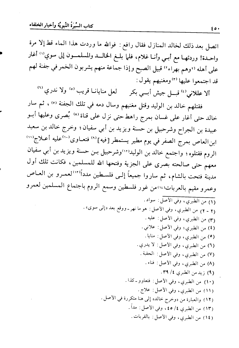 فقتلهم خالد بن الوليد وقتل مغنيهم وسال دمه في تلك الجفنة «7» ، ثم سار خالد حتى أغار على غسان بمرج راهط حتى نزل على قناة «8» بصرى وعليها أبو عبيدة بن الجراح وشرحبيل بن حسنة ويزيد بن أبي سفيان؛ وخرج خالد بن سعيد ابن العاص بمرج الصفر في يوم مطير يستمطر [فيه] »