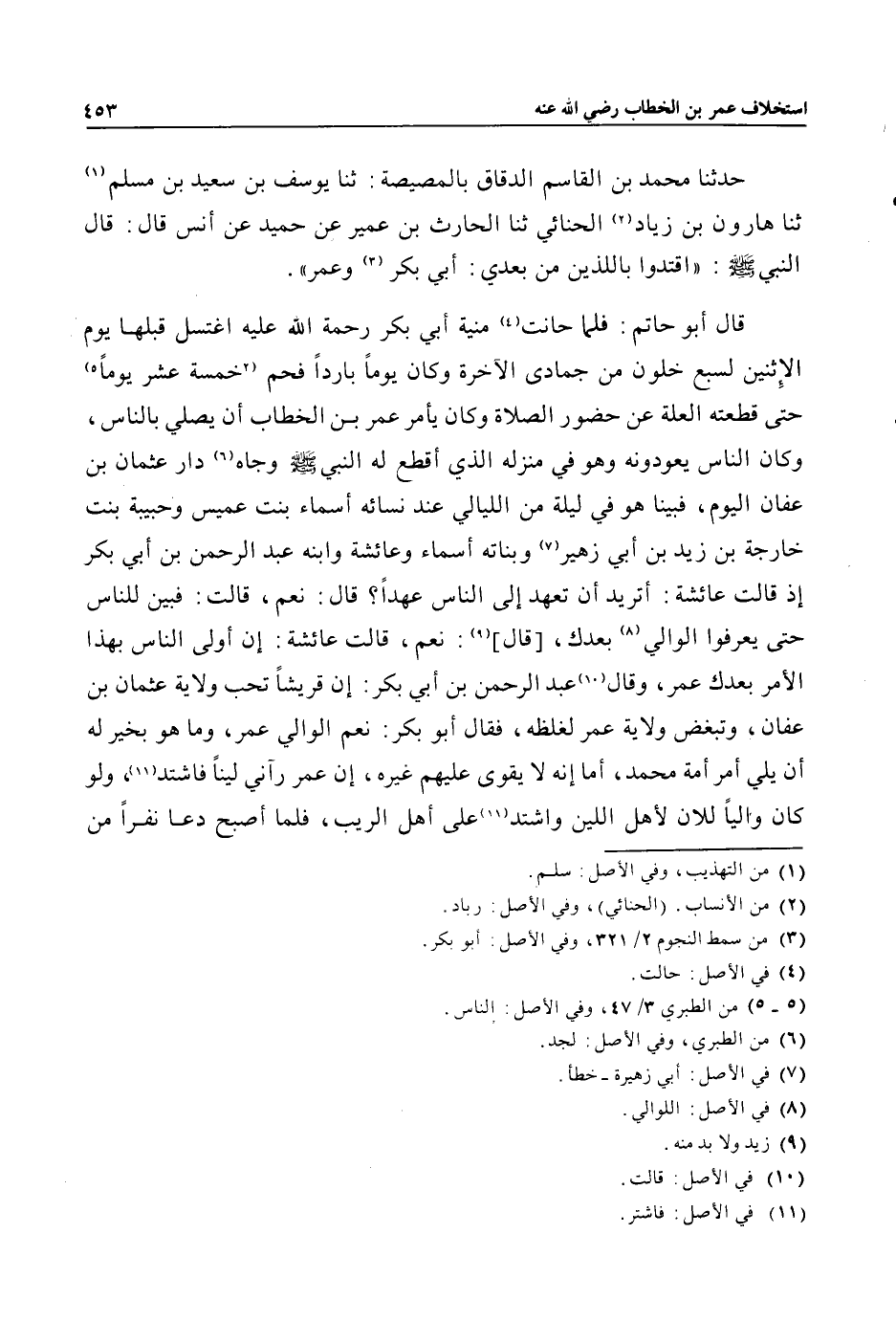 قال أبو حاتم: فلما حانت «4» منية أبي بكر رحمة الله عليه اغتسل قبلها يوم الإثنين لسبع خلون من جمادى الآخرة وكان يوما باردا فحم «2» خمسة عشر يوما «5» حتى قطعته العلة عن حضور الصلاة وكان يأمر عمر بن الخطاب أن يصلي بالناس، وكان الناس يعودونه وهو في منزله الذي أقطع له النبي صلى الله عليه وسلم وجاه «6» دار عثمان بن عفان اليوم، فبينا هو في ليلة من الليالي عند نسائه أسماء بنت عميس وحبيبة بنت خارجة بن زيد بن أبي زهير «7» وبناته أسماء وعائشة وابنه عبد الرحمن بن أبي بكر إذ قالت عائشة: أتريد أن تعهد إلى الناس عهدا؟ قال: نعم، قالت: فبين للناس حتى يعرفوا الوالي «8» بعدك، [قال] «9» : نعم، قالت عائشة: إن أولى الناس بهذا الأمر بعدك عمر، وقال «10» عبد الرحمن بن أبي بكر: إن قريشا تحب ولاية عثمان بن عفان، وتبغض ولاية عمر لغلظه، فقال أبو بكر: نعم الوالي عمر، وما هو بخير له أن يلي أمر أمة محمد، أما إنه لا يقوى عليهم غيره، إن عمر رآني لينا فاشتد «11» ، ولو كان واليا للان لأهل اللين واشتد «11» على أهل الريب، فلما أصبح دعا نفرا من