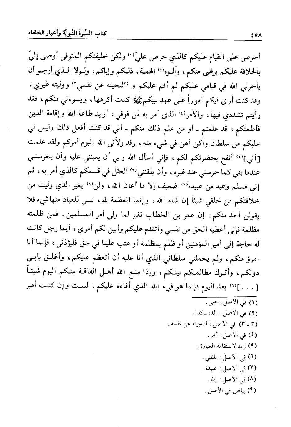 أحرص على القيام عليكم كالذي حرص عليّ «1» ولكن خليفتكم المتوفى أوصى إليّ بالخلافة عليكم برضى منكم، وآلوه «2» الهمة، ذلكم وإياكم، ولولا الذي أرجو أن يأجرني الله في قيامي عليكم لم أقم عليكم و «3» لنحيته عن نفسي «3» ووليته غيري، وقد كنت أرى فيكم أمورا على عهد نبيكم صلى الله عليه وسلم كدت أكرهها، ويسوءني منكم، فقد رأيتم تشددي فيها، والأمر «4» الذي أمر به من فوقي، أريد طاعة الله وإقامة الدين فأطعتكم، قد علمتم- أو من علم ذلك منكم- أني قد كنت أفعل ذلك وليس لي عليكم من سلطان وأكن أهن في شيء منه، وقد ولّاني الله اليوم أمركم ولقد علمت [أني] «5» أنفع بحضرتكم لكم، فإني أسأل الله ربي أن يعينني عليه وأن يحرسني عندما بقي كما حرسني عند غيره، وأن يلقنني «6» العقل في قسمكم كالذي أمر به، ثم إني مسلم وعبد من عبيده «7» ضعيف إلا ما أعان الله، ولن «8» يغير الذي وليت من خلافتكم من خلقي شيئا إن شاء الله، وإنما العظمة لله، ليس للعباد منها شيء فلا يقولن أحد منكم: إن عمر بن الخطاب تغير لما ولي أمر المسلمين، فمن ظلمته مظلمة فإني أعطيه الحق من نفسي وأتقدم عليكم وأبين لكم أمري، أيما رجل كانت له حاجة إلى أمير المؤمنين أو ظلم بمظلمة أو عتب علينا في حق فليؤذني، فإنما أنا امرؤ منكم، ولم يحملني سلطاني الذي أنا عليه أن أتعظم عليكم، وأغلق بابي دونكم، وأترك مظالمكم بينكم، وإذا منع الله أهل الفاقة منكم اليوم شيئا [ ... ] »