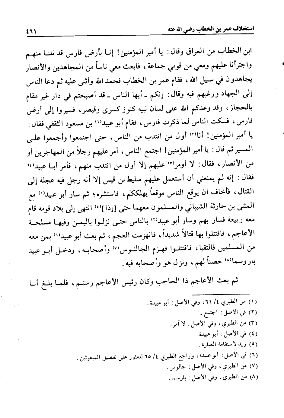 يا أمير المؤمنين! أنا «2» أول من انتدب من الناس، حتى اجتمعوا وأجمعوا على المسير ثم قال: يا أمير المؤمنين! اجتمع الناس، أمر عليهم رجلا من المهاجرين أو من الأنصار، فقال: لا أومر «3» عليهم إلا أول من انتدب منهم، فأمر أبا عبيد «4» فقال: إنه لم يمنعني أن أستعمل عليهم سليط بن قيس إلا أنه رجل فيه عجلة إلى القتال، فأخاف أن يوقع الناس موقعا يهلككم، فاستشره؛ ثم سار أبو عبيد «1» مع المثنى بن حارثة الشيباني والمسلمون معهما حتى [إذا] «5» انتهى إلى بلاد قومه قام معه ربيعة فسار بهم وسار أبو عبيد «2» بالناس حتى نزلوا باليمن وفيها مسلحة الأعاجم، فاقتتلوا بها قتالا شديدا، فانهزمت العجم، ثم بعث أبو عبيد «6» بمن معه من المسلمين فالتقيا، فاقتتلوا فهزم الجالنوس «7» وأصحابه، ودخل أبو عبيد باروسما «8» حصنا لهم، ونزل هو وأصحابه فيه.