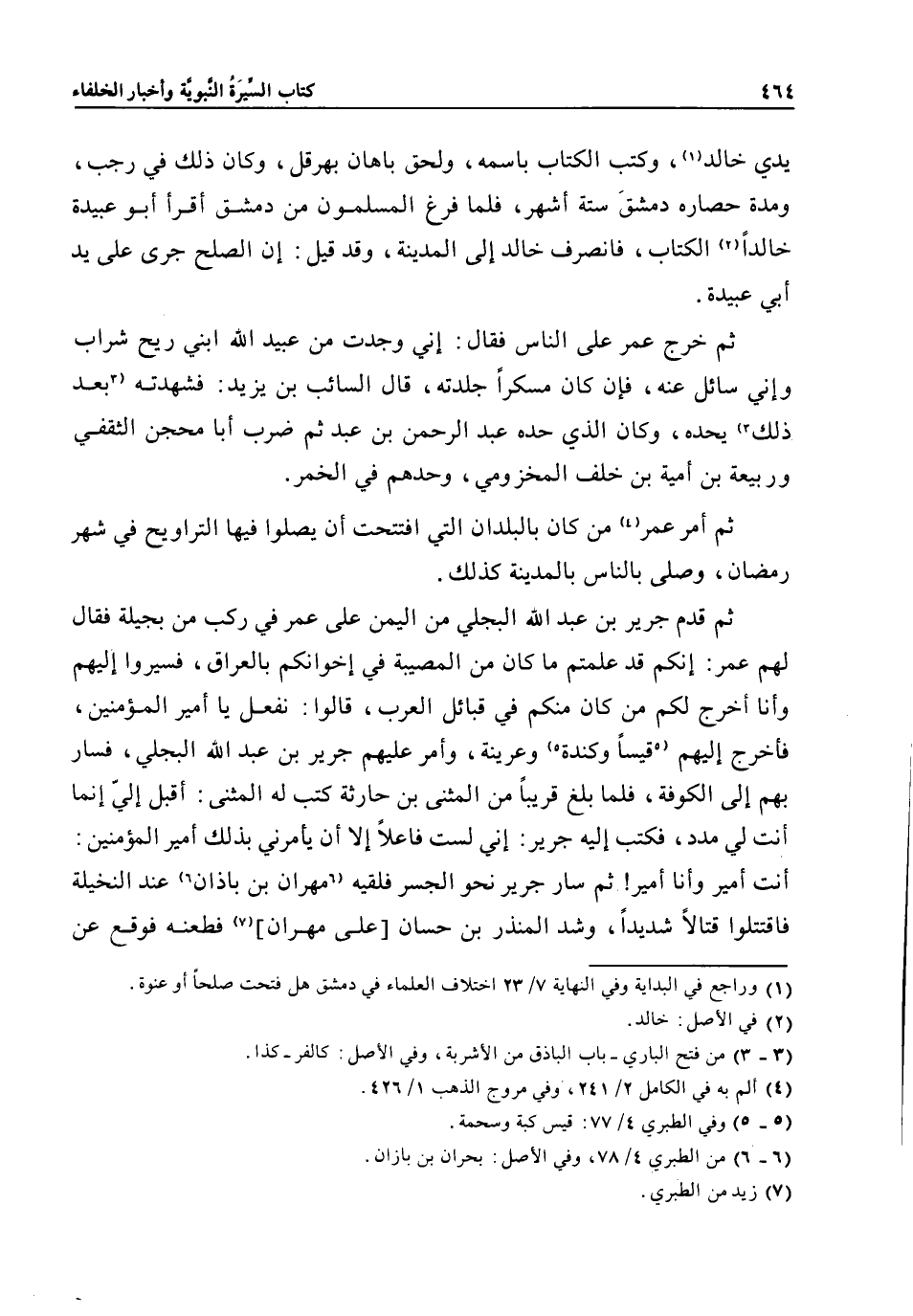 يدي خالد «1» ، وكتب الكتاب باسمه، ولحق باهان بهرقل، وكان ذلك في رجب، ومدة حصاره دمشق ستة أشهر، فلما فرغ المسلمون من دمشق أقرأ أبو عبيدة خالدا «2» الكتاب، فانصرف خالد إلى المدينة، وقد قيل: إن الصلح جرى على يد أبي عبيدة.