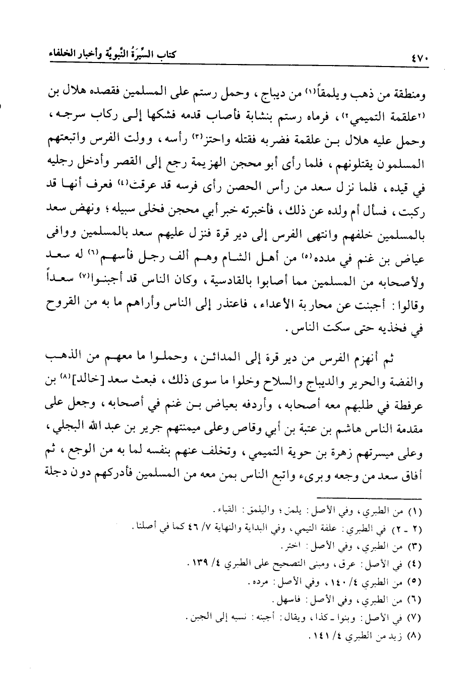 ومنطقة من ذهب ويلمقا «1» من ديباج، وحمل رستم على المسلمين فقصده هلال بن «2» علقمة التميمي «2» ، فرماه رستم بنشابة فأصاب قدمه فشكها إلى ركاب سرجه، وحمل عليه هلال بن علقمة فضربه فقتله واحتز «3» رأسه، وولت الفرس واتبعتهم المسلمون يقتلونهم، فلما رأى أبو محجن الهزيمة رجع إلى القصر وأدخل رجليه في قيده، فلما نزل سعد من رأس الحصن رأى فرسه قد عرقت «4» فعرف أنها قد ركبت، فسأل أم ولده عن ذلك، فأخبرته خبر أبي محجن فخلى سبيله؛ ونهض سعد بالمسلمين خلفهم وانتهى الفرس إلى دير قرة فنزل عليهم سعد بالمسلمين ووافى عياض بن غنم في مدده «5» من أهل الشام وهم ألف رجل فأسهم «6» له سعد ولأصحابه من المسلمين مما أصابوا بالقادسية، وكان الناس قد أجبنوا «7» سعدا وقالوا: أجبنت عن محاربة الأعداء، فاعتذر إلى الناس وأراهم ما به من القروح في فخذيه حتى سكت الناس.