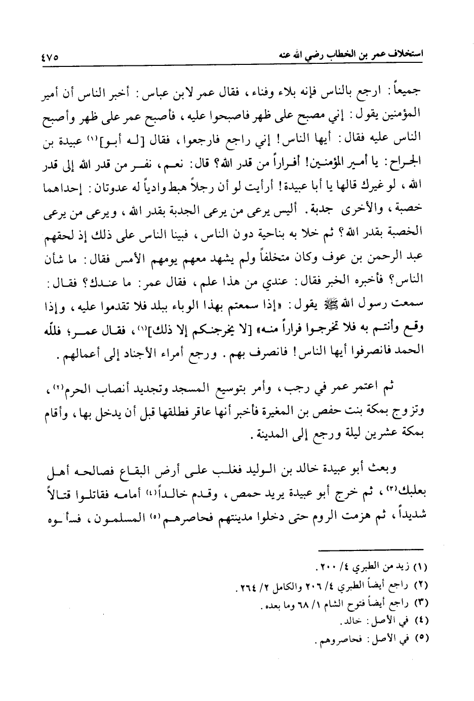 جميعا: ارجع بالناس فإنه بلاء وفناء، فقال عمر لابن عباس: أخبر الناس أن أمير المؤمنين يقول: إني مصبح على ظهر فاصبحوا عليه، فأصبح عمر على ظهر وأصبح الناس عليه فقال: أيها الناس! إني راجع فارجعوا، فقال [له أبو] «1» عبيدة بن الجراح: يا أمير المؤمنين! أفرارا من قدر الله؟ قال: نعم، نفر من قدر الله إلى قدر الله، لو غيرك قالها يا أبا عبيدة! أرأيت لو أن رجلا هبط واديا له عدوتان: إحداهما خصبة، والأخرى جدبة. أليس يرعى من يرعى الجدبة بقدر الله، ويرعى من يرعى الخصبة بقدر الله؟ ثم خلا به بناحية دون الناس، فبينا الناس على ذلك إذ لحقهم عبد الرحمن بن عوف وكان متخلفا ولم يشهد معهم يومهم الأمس فقال: ما شأن الناس؟ فأخبره الخبر فقال: عندي من هذا علم، فقال عمر: ما عندك؟ فقال: