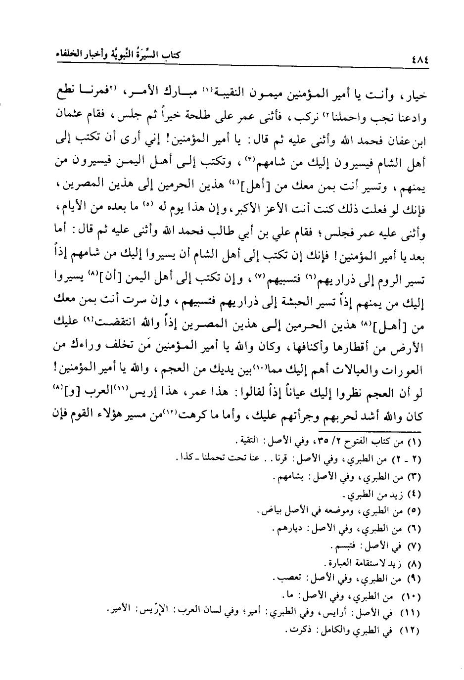 خيار، وأنت يا أمير المؤمنين ميمون النقيبة «1» مبارك الأمر، «2» فمرنا نطع وادعنا نجب واحملنا «2» نركب، فأثنى عمر على طلحة خيرا ثم جلس، فقام عثمان ابن عفان فحمد الله وأثنى عليه ثم قال: يا أمير المؤمنين! إني أرى أن تكتب إلى أهل الشام فيسيرون إليك من شامهم «3» ، وتكتب إلى أهل اليمن فيسيرون من يمنهم، وتسير أنت بمن معك من [أهل] «4» هذين الحرمين إلى هذين المصرين، فإنك لو فعلت ذلك كنت أنت الأعز الأكبر، وإن هذا يوم له «5» ما بعده من الأيام، وأثنى عليه عمر فجلس؛ فقام علي بن أبي طالب فحمد الله وأثنى عليه ثم قال: أما بعد يا أمير المؤمنين! فإنك إن تكتب إلى أهل الشام أن يسيروا إليك من شامهم إذا تسير الروم إلى ذراريهم «6» فتسبيهم «7» ، وإن تكتب إلى أهل اليمن [أن] «8» يسيروا إليك من يمنهم إذا تسير الحبشة إلى ذراريهم فتسبيهم، وإن سرت أنت بمن معك من [أهل] «8» هذين الحرمين إلى هذين المصرين إذا والله انتقضت «9» عليك الأرض من أقطارها وأكنافها، وكان والله يا أمير المؤمنين من تخلف وراءك من العورات والعيالات أهم إليك مما «10» بين يديك من العجم، والله يا أمير المؤمنين! لو أن العجم نظروا إليك عيانا إذا لقالوا: هذا عمر، هذا إريس «11» العرب [و] «8» كان والله أشد لحربهم وجرأتهم عليك، وأما ما كرهت «12» من مسير هؤلاء القوم فإن