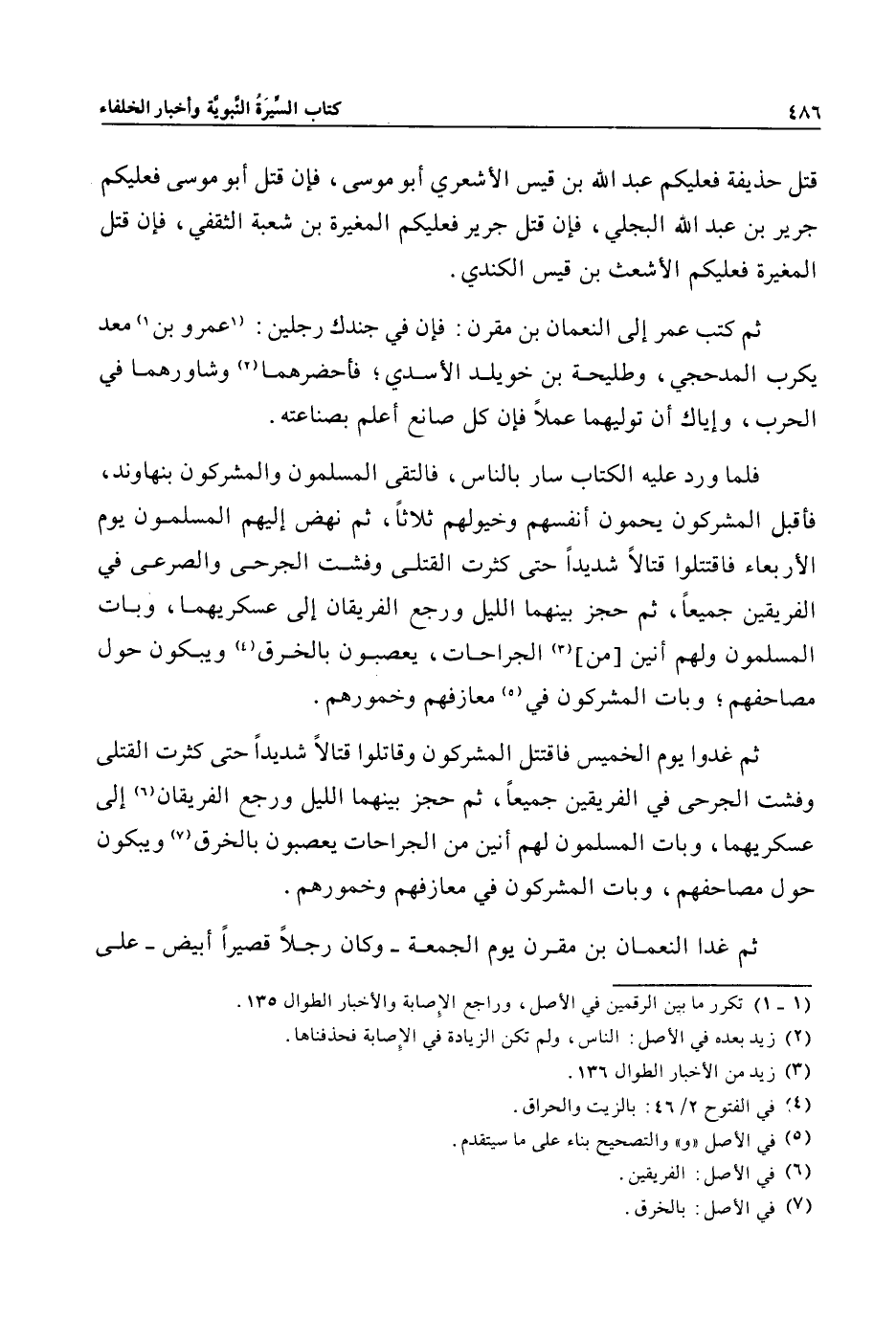 فلما ورد عليه الكتاب سار بالناس، فالتقى المسلمون والمشركون بنهاوند، فأقبل المشركون يحمون أنفسهم وخيولهم ثلاثا، ثم نهض إليهم المسلمون يوم الأربعاء فاقتتلوا قتالا شديدا حتى كثرت القتلى وفشت الجرحى والصرعى في الفريقين جميعا، ثم حجز بينهما الليل ورجع الفريقان إلى عسكريهما، وبات المسلمون ولهم أنين [من] «3» الجراحات، يعصبون بالخرق «4» ويبكون حول مصاحفهم؛ وبات المشركون في «5» معازفهم وخمورهم.