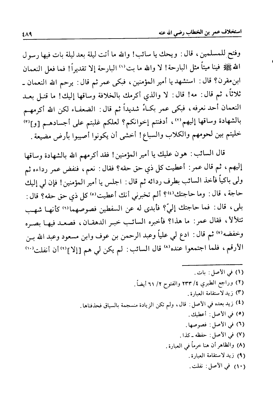 وفتح للمسلمين، قال: ويحك يا سائب! والله ما أتت ليلة بعد ليلة بات فيها رسول الله صلى الله عليه وسلم فينا ميتا مثل البارحة! لا والله ما بت «1» البارحة إلا تقديرا! فما فعل النعمان ابن مقرن؟ قال: استشهد يا أمير المؤمنين، فبكى عمر ثم قال: يرحم الله النعمان- ثلاثا، ثم قال: مه! قال: لا والذي أكرمك بالخلافة وساقها إليك! ما قتل بعد النعمان أحد نعرفه، فبكى عمر بكاء شديدا ثم قال: الضعفاء لكن الله أكرمهم بالشهادة وساقها إليهم»