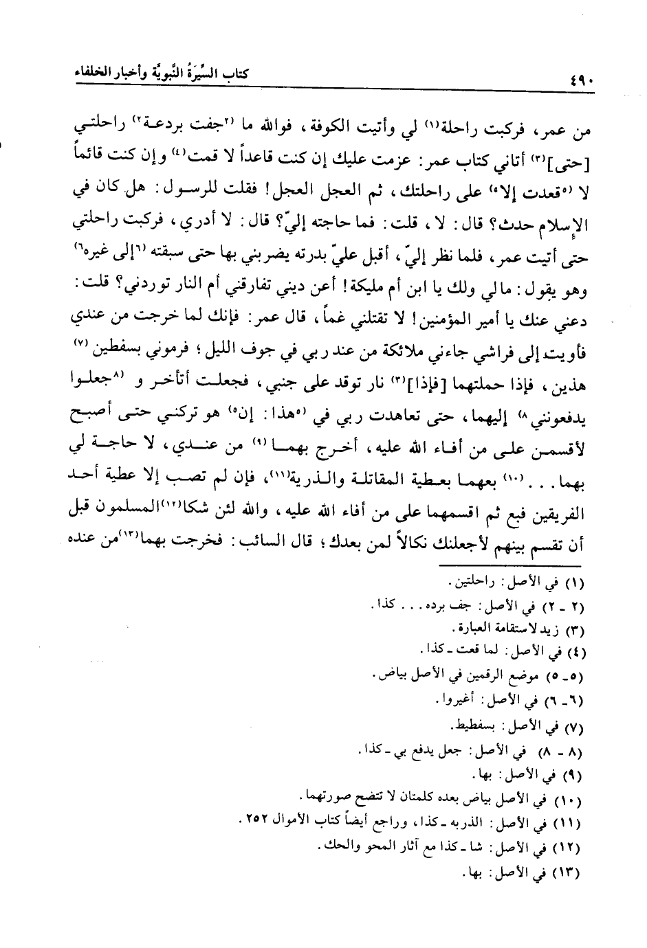 دعني عنك يا أمير المؤمنين! لا تقتلني غما، قال عمر: فإنك لما خرجت من عندي فأويت إلى فراشي جاءني ملائكة من عند ربي في جوف الليل؛ فرموني بسفطين «7» هذين، فإذا حملتهما [فإذا] «3» نار توقد على جنبي، فجعلت أتأخر و «8» جعلوا يدفعونني «8» إليهما، حتى تعاهدت ربي في «5» هذا: إن «5» هو تركني حتى أصبح لأقسمن على من أفاء الله عليه، أخرج بهما «9» من عندي، لا حاجة لي بهما ... «10» بعهما بعطية المقاتلة والذرية «11» ، فإن لم تصب إلا عطية أحد الفريقين فبع ثم اقسمهما على من أفاء الله عليه، والله لئن شكا «12» المسلمون قبل أن تقسم بينهم لأجعلنك نكالا لمن بعدك؛ قال السائب: فخرجت بهما «13» من عنده