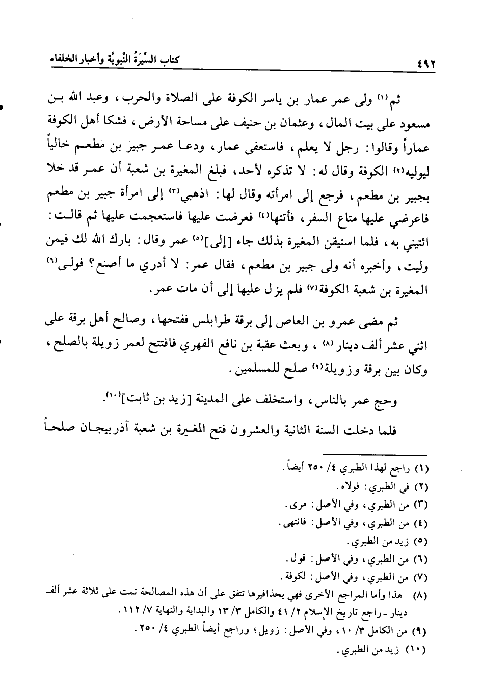 ائتيني به، فلما استيقن المغيرة بذلك جاء [إلى] «5» عمر وقال: بارك الله لك فيمن وليت، وأخبره أنه ولى جبير بن مطعم، فقال عمر: لا أدري ما أصنع؟ قولى «6» المغيرة بن شعبة الكوفة «7» فلم يزل عليها إلى أن مات عمر.