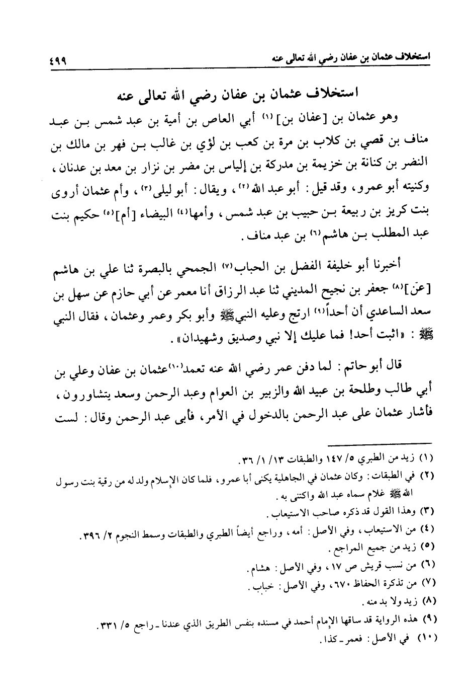 (2) في الطبقات: وكان عثمان في الجاهلية يكنى أبا عمرو، فلما كان الإسلام ولد له من رقية بنت رسول الله صلى الله عليه وسلم غلام سماه عبد الله واكتنى به.