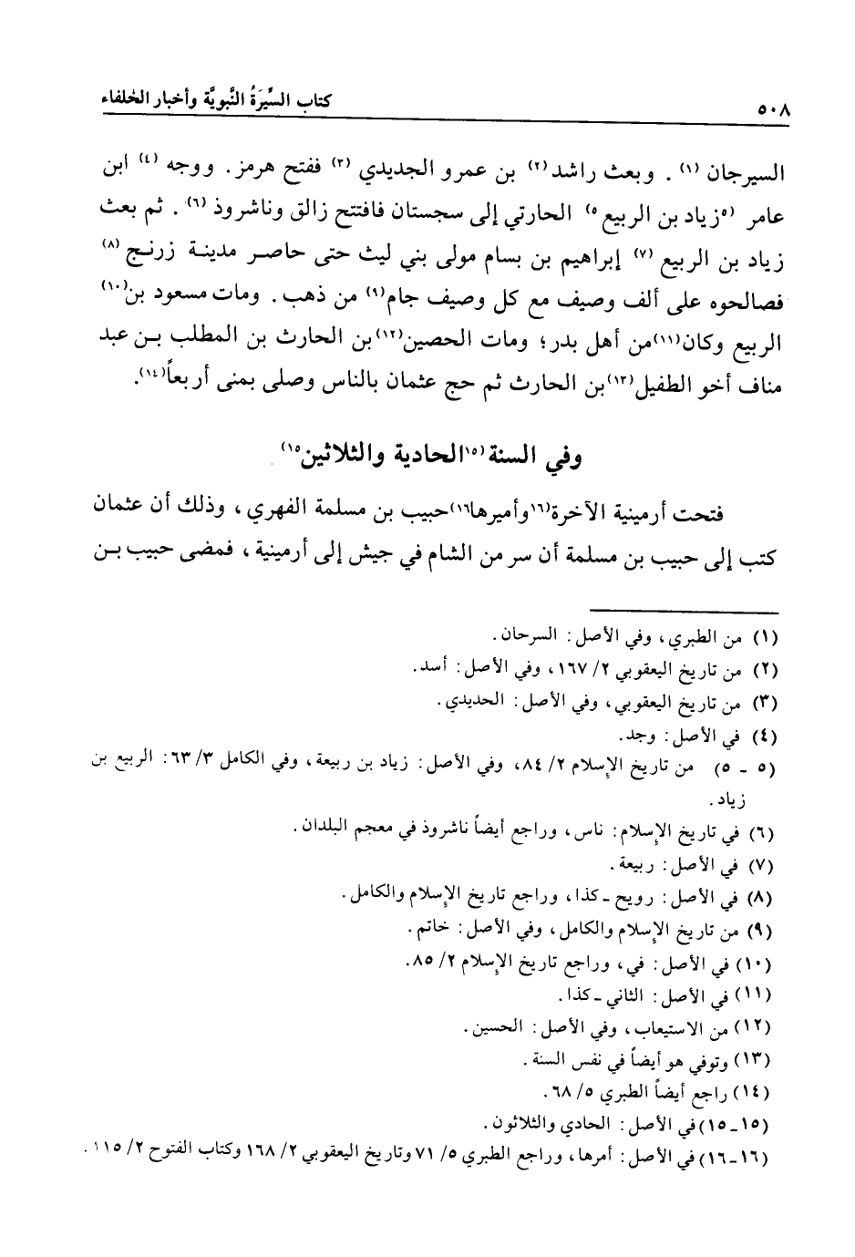 السيرجان «1» . وبعث راشد «2» بن عمرو الجديدي «3» ففتح هرمز. ووجه «4» ابن عامر «5» زياد بن الربيع «5» الحارتي إلى سجستان فافتتح زالق وناشروذ «6» . ثم بعث زياد بن الربيع «7» إبراهيم بن بسام مولى بني ليث حتى حاصر مدينة زرنج «8» فصالحوه على ألف وصيف مع كل وصيف جام «9» من ذهب. ومات مسعود بن «10» الربيع وكان «11» من أهل بدر؛ ومات الحصين «12» بن الحارث بن المطلب بن عبد مناف أخو الطفيل «13» بن الحارث ثم حج عثمان بالناس وصلى بمنى أربعا «14» .