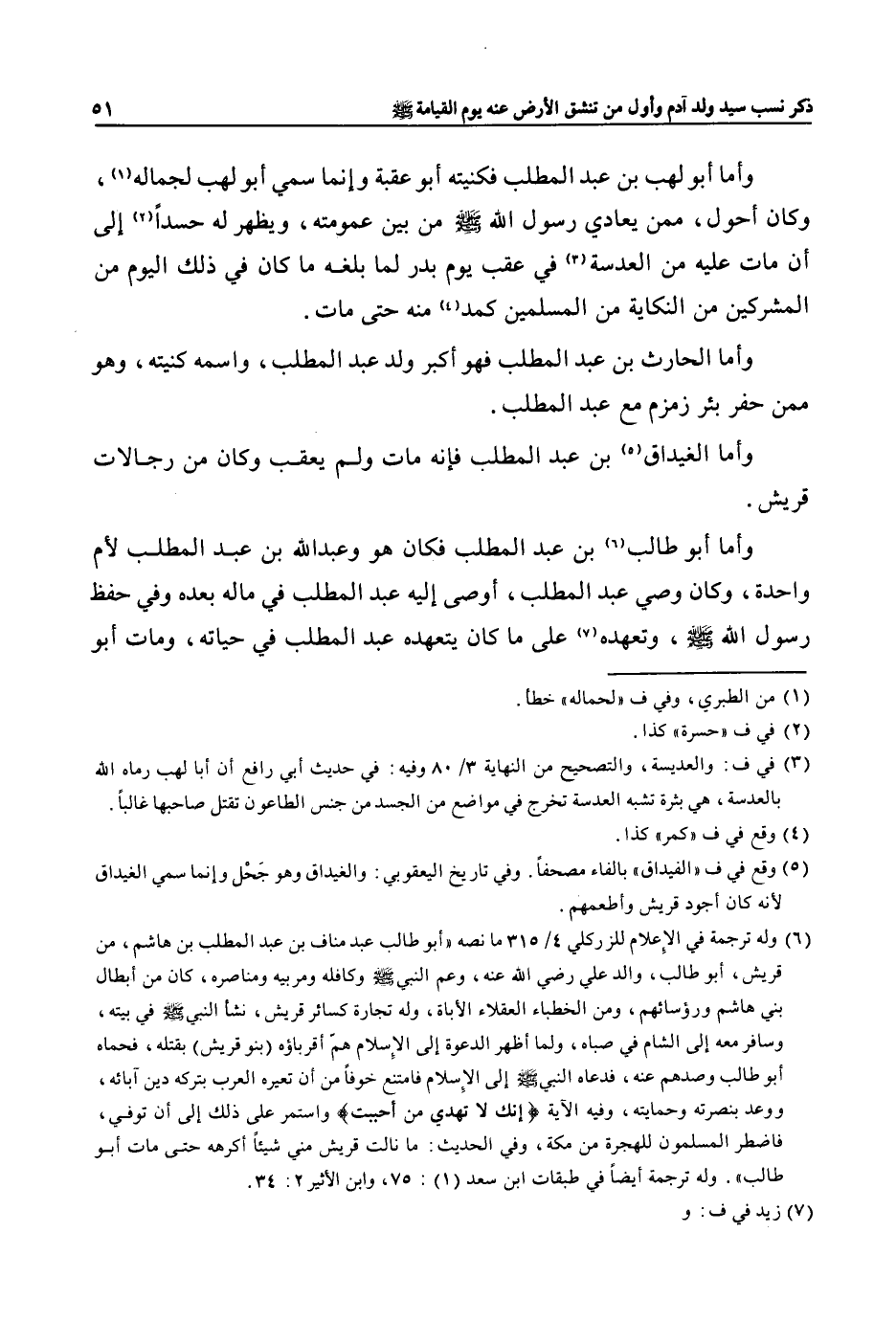 وأما أبو لهب بن عبد المطلب فكنيته أبو عقبة وإنما سمي أبو لهب لجماله «1» ، وكان أحول، ممن يعادي رسول الله صلى الله عليه وسلم من بين عمومته، ويظهر له حسدا «2» إلى أن مات عليه من العدسة «3» في عقب يوم بدر لما بلغه ما كان في ذلك اليوم من المشركين من النكاية من المسلمين كمد «4» منه حتى مات.