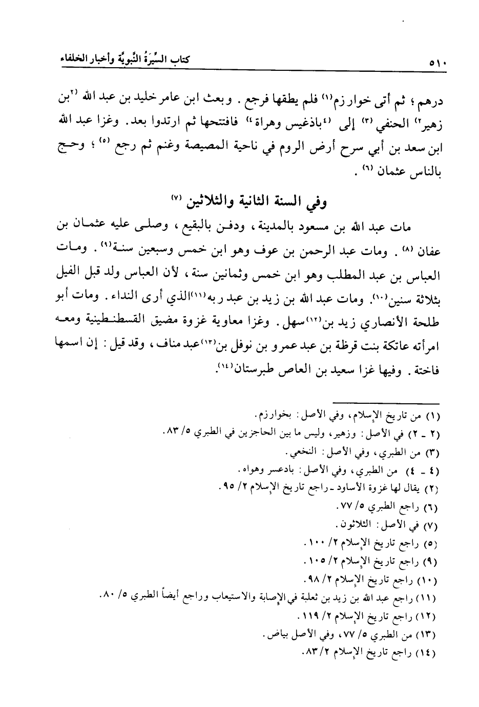 مات عبد الله بن مسعود بالمدينة، ودفن بالبقيع، وصلى عليه عثمان بن عفان «8» . ومات عبد الرحمن بن عوف وهو ابن خمس وسبعين سنة «9» . ومات العباس بن عبد المطلب وهو ابن خمس وثمانين سنة، لأن العباس ولد قبل الفيل بثلاثة سنين «10» . ومات عبد الله بن زيد بن عبد ربه «11» الذي أرى النداء. ومات أبو طلحة الأنصاري زيد بن «12» سهل. وغزا معاوية غزوة مضيق القسطنطينية ومعه امرأته عاتكة بنت قرظة بن عبد عمرو بن نوفل بن «13» عبد مناف، وقد قيل: إن اسمها فاختة. وفيها غزا سعيد بن العاص طبرستان «14» .