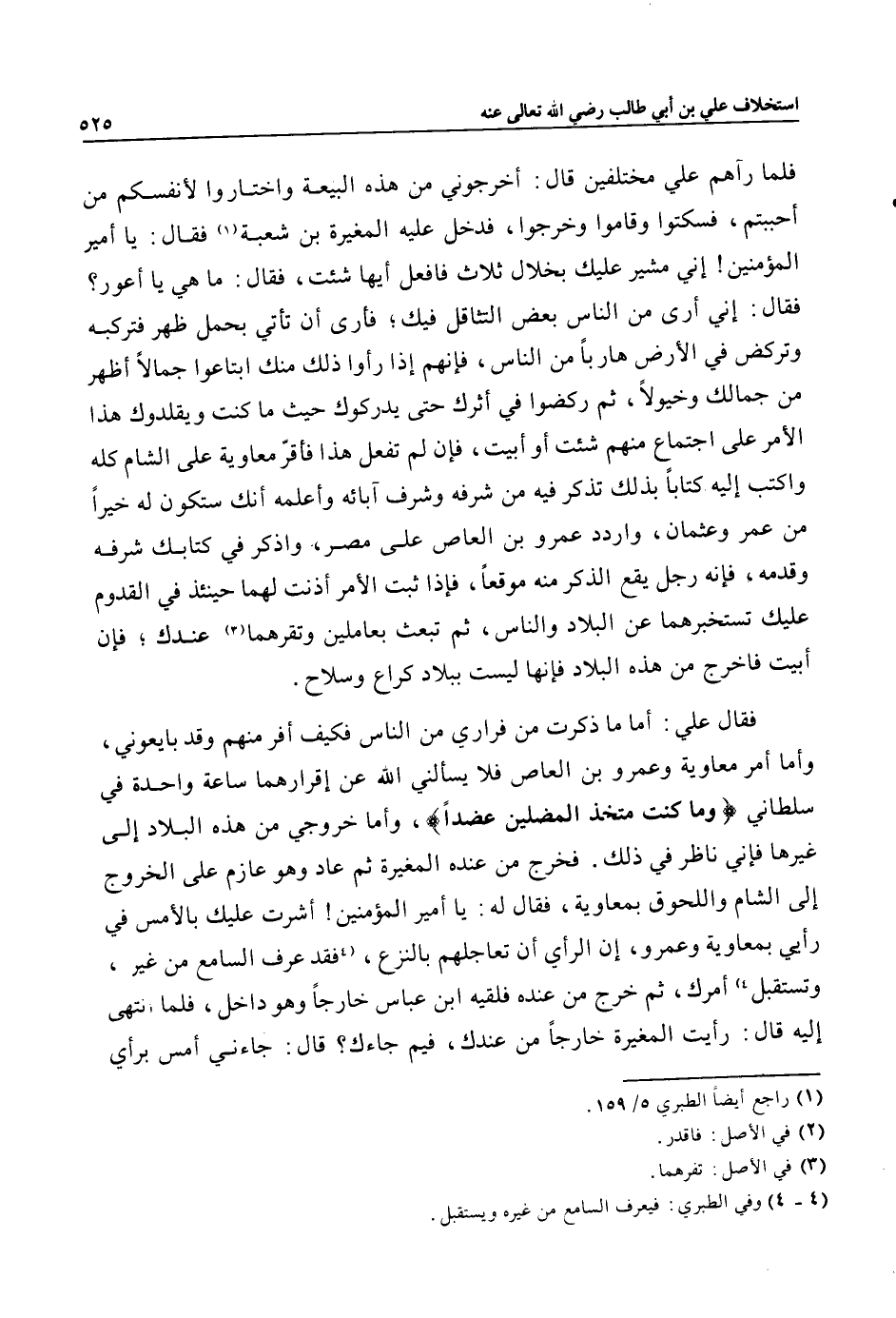 فقال علي: أما ما ذكرت من فراري من الناس فكيف أفر منهم وقد بايعوني، وأما أمر معاوية وعمرو بن العاص فلا يسألني الله عن إقرارهما ساعة واحدة في سلطاني وَما كُنْتُ مُتَّخِذَ الْمُضِلِّينَ عَضُداً، وأما خروجي من هذه البلاد إلى غيرها فإني ناظر في ذلك. فخرج من عنده المغيرة ثم عاد وهو عازم على الخروج إلى الشام واللحوق بمعاوية، فقال له: يا أمير المؤمنين! أشرت عليك بالأمس في رأيي بمعاوية وعمرو، إن الرأي أن تعاجلهم بالنزع، «4» فقد عرف السامع من غيره، وتستقبل «4» أمرك، ثم خرج من عنده فلقيه ابن عباس خارجا وهو داخل، فلما انتهى إليه قال: رأيت المغيرة خارجا من عندك، فيم جاءك؟ قال: جاءني أمس برأي