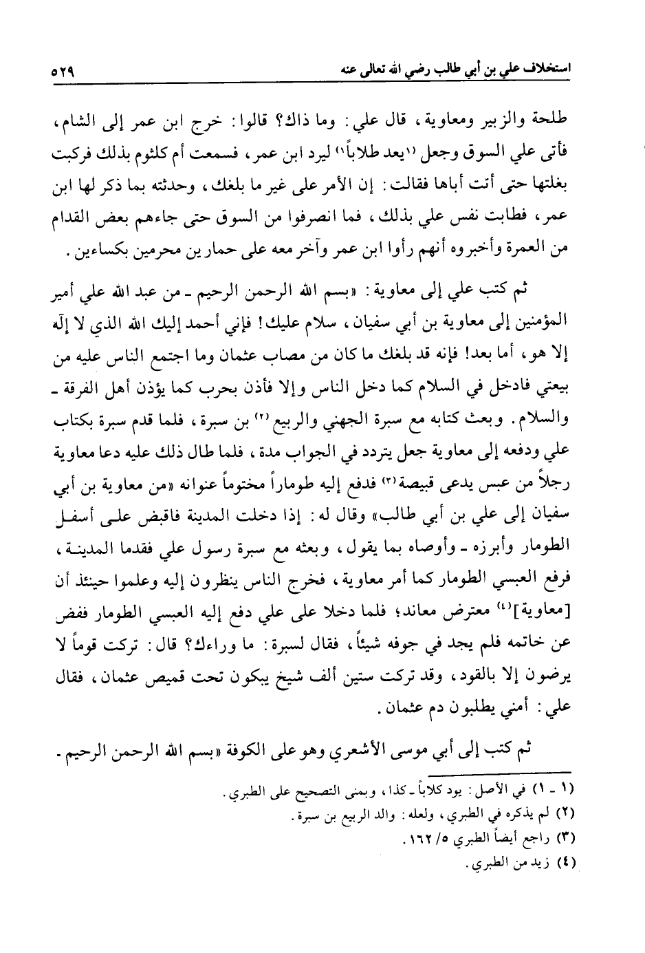 ثم كتب علي إلى معاوية: «بسم الله الرحمن الرحيم- من عبد الله علي أمير المؤمنين إلى معاوية بن أبي سفيان، سلام عليك! فإني أحمد إليك الله الذي لا إله إلا هو، أما بعد! فإنه قد بلغك ما كان من مصاب عثمان وما اجتمع الناس عليه من بيعتي فادخل في السلام كما دخل الناس وإلا فأذن بحرب كما يؤذن أهل الفرقة- والسلام. وبعث كتابه مع سبرة الجهني والربيع «2» بن سبرة، فلما قدم سبرة بكتاب علي ودفعه إلى معاوية جعل يتردد في الجواب مدة، فلما طال ذلك عليه دعا معاوية رجلا من عبس يدعى قبيصة «3» فدفع إليه طومارا مختوما عنوانه «من معاوية بن أبي سفيان إلى علي بن أبي طالب» وقال له: إذا دخلت المدينة فاقبض على أسفل الطومار وأبرزه- وأوصاه بما يقول، وبعثه مع سبرة رسول علي فقدما المدينة، فرفع العبسي الطومار كما أمر معاوية، فخرج الناس ينظرون إليه وعلموا حينئذ أن [معاوية] «4» معترض معاند؛ فلما دخلا على علي دفع إليه العبسي الطومار ففض عن خاتمه فلم يجد في جوفه شيئا، فقال لسبرة: ما وراءك؟ قال: تركت قوما لا يرضون إلا بالقود، وقد تركت ستين ألف شيخ يبكون تحت قميص عثمان، فقال علي: أمني يطلبون دم عثمان.