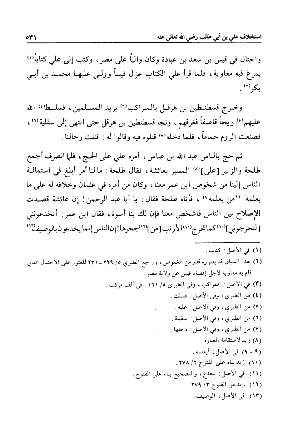 (2) هذا السياق قد يعتوره قدر من الغموض، وراجع الطبري 5/ 229- 231 للعثور على الاحتيال الذي قام به معاوية لأجل إقصاء قيس عن ولاية مصر.