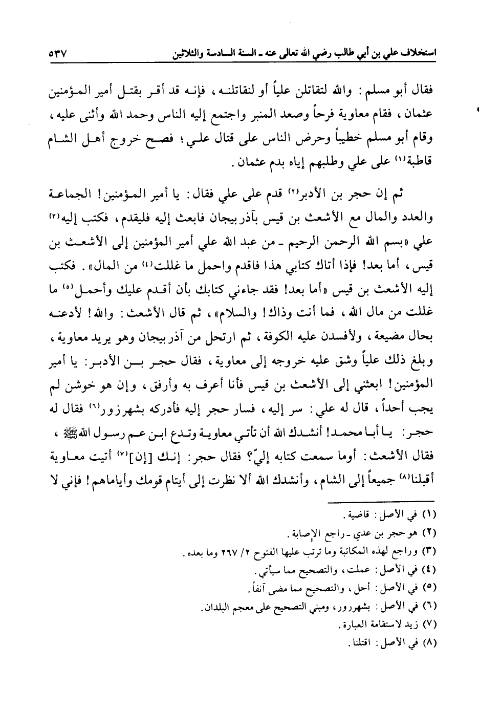 ثم إن حجر بن الأدبر «2» قدم على علي فقال: يا أمير المؤمنين! الجماعة والعدد والمال مع الأشعث بن قيس بآذربيجان فابعث إليه فليقدم، فكتب إليه «3» علي «بسم الله الرحمن الرحيم- من عبد الله علي أمير المؤمنين إلى الأشعث بن قيس، أما بعد! فإذا أتاك كتابي هذا فاقدم واحمل ما غللت «4» من المال» . فكتب إليه الأشعث بن قيس «أما بعد! فقد جاءني كتابك بأن أقدم عليك وأحمل «5» ما غللت من مال الله، فما أنت وذاك! والسلام» ، ثم قال الأشعث: والله! لأدعنه بحال مضيعة، ولأفسدن عليه الكوفة، ثم ارتحل من آذربيجان وهو يريد معاوية، وبلغ ذلك عليا وشق عليه خروجه إلى معاوية، فقال حجر بن الأدبر: يا أمير المؤمنين! ابعثني إلى الأشعث بن قيس فأنا أعرف به وأرفق، وإن هو خوشن لم يجب أحدا، قال له علي: سر إليه، فسار حجر إليه فأدركه بشهرزور «6» فقال له حجر: يا أبا محمد! أنشدك الله أن تأتي معاوية وتدع ابن عم رسول الله صلى الله عليه وسلم، فقال الأشعث: أوما سمعت كتابه إليّ؟ فقال حجر: إنك [إن] «7» أتيت معاوية أقبلنا «8» جميعا إلى الشام، وأنشدك الله ألا نظرت إلى أيتام قومك وأياماهم! فإني لا