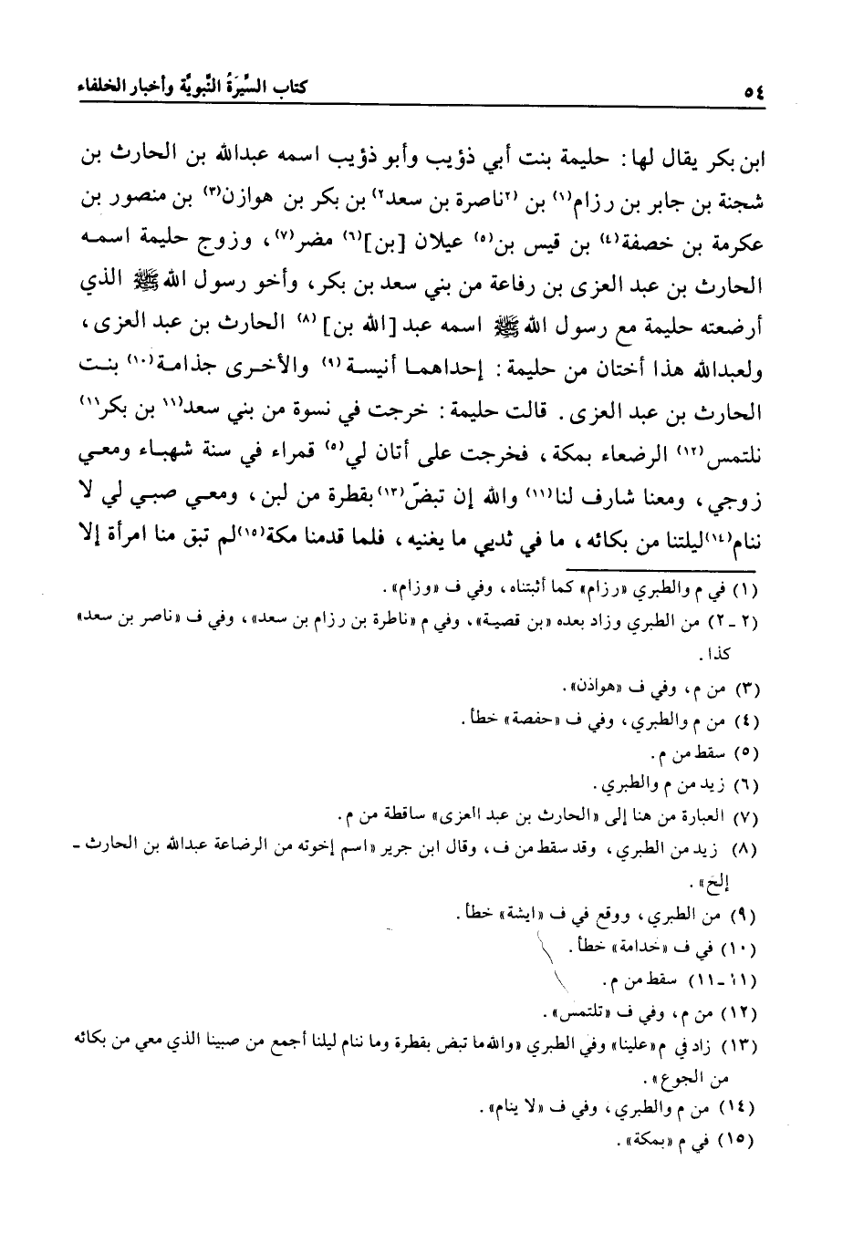 ابن بكر يقال لها: حليمة بنت أبي ذؤيب وأبو ذؤيب اسمه عبد الله بن الحارث بن شجنة بن جابر بن رزام «1» بن «2» صرة بن سعد 2 بن بكر بن هوازن «3» بن منصور بن عكرمة بن خصفة «4» بن قيس بن «5» عيلان [بن] «6» مضر «7» ، وزوج حليمة اسمه الحارث بن عبد العزى بن رفاعة من بني سعد بن بكر، وأخو رسول الله صلى الله عليه وسلم الذي أرضعته حليمة مع رسول الله صلى الله عليه وسلم اسمه عبد [الله بن] «8» الحارث بن عبد العزى، ولعبد الله هذا أختان من حليمة: إحداهما أنيسة «9» والأخرى جذامة «10» بنت الحارث بن عبد العزى. قالت حليمة: خرجت في نسوة من بني سعد «11» بكر 11 نلتمس «12» الرضعاء بمكة، فخرجت على أتان لي «5» قمراء في سنة شهباء ومعي زوجي، ومعنا شارف لنا «11» والله إن تبضّ «13» بقطرة من لبن، ومعي صبي لي لا ننام «14» ليلتنا من بكائه، ما في ثديي ما يغنيه، فلما قدمنا مكة «15» لم تبق منا امرأة إلا