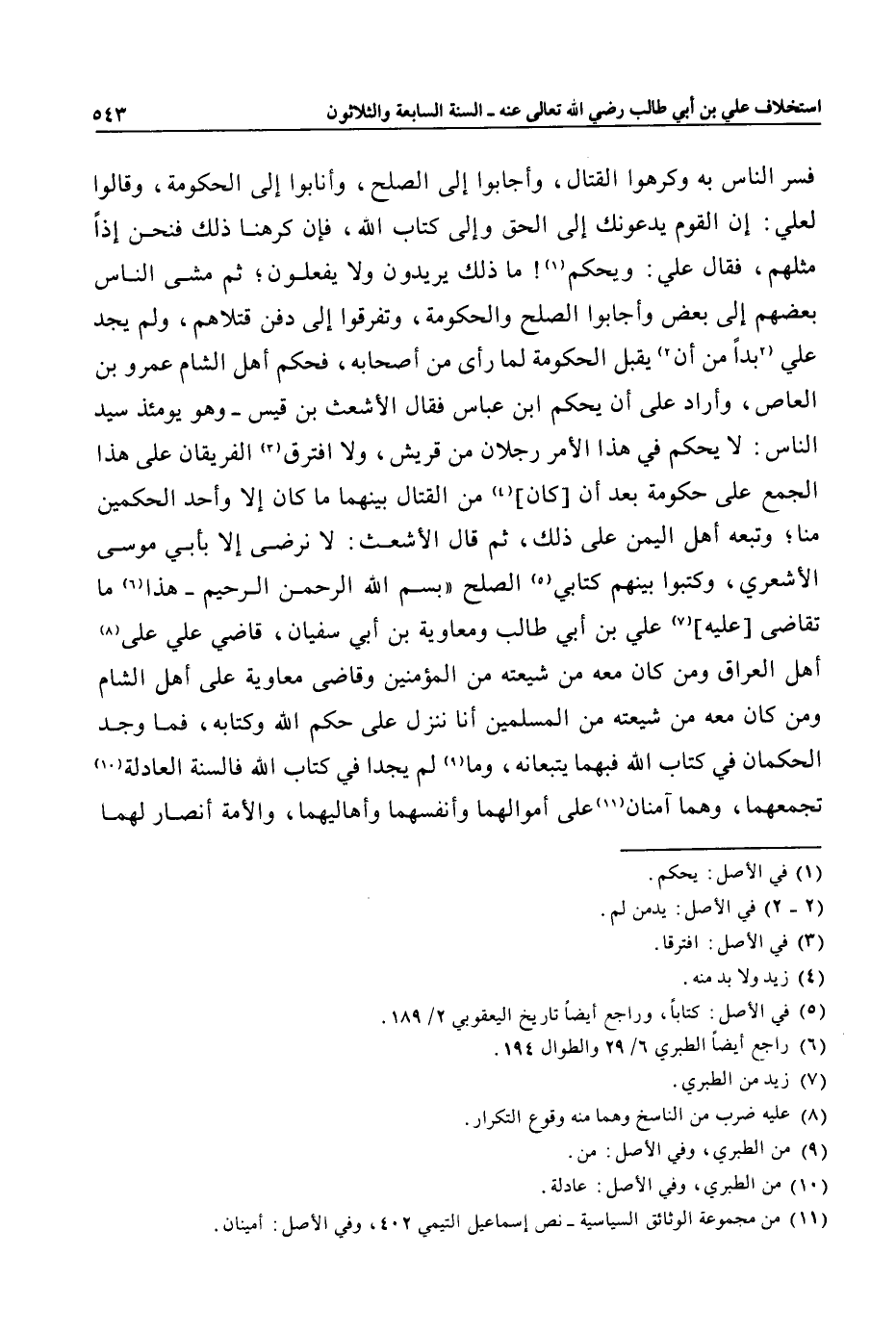 علي بن أبي طالب ومعاوية بن أبي سفيان، قاضي علي على «8» أهل العراق ومن كان معه من شيعته من المؤمنين وقاضى معاوية على أهل الشام ومن كان معه من شيعته من المسلمين أنا ننزل على حكم الله وكتابه، فما وجد الحكمان في كتاب الله فبهما يتبعانه، وما «9» لم يجدا في كتاب الله فالسنة العادلة «10» تجمعهما، وهما آمنان «11» على أموالهما وأنفسهما وأهاليهما، والأمة أنصار لهما